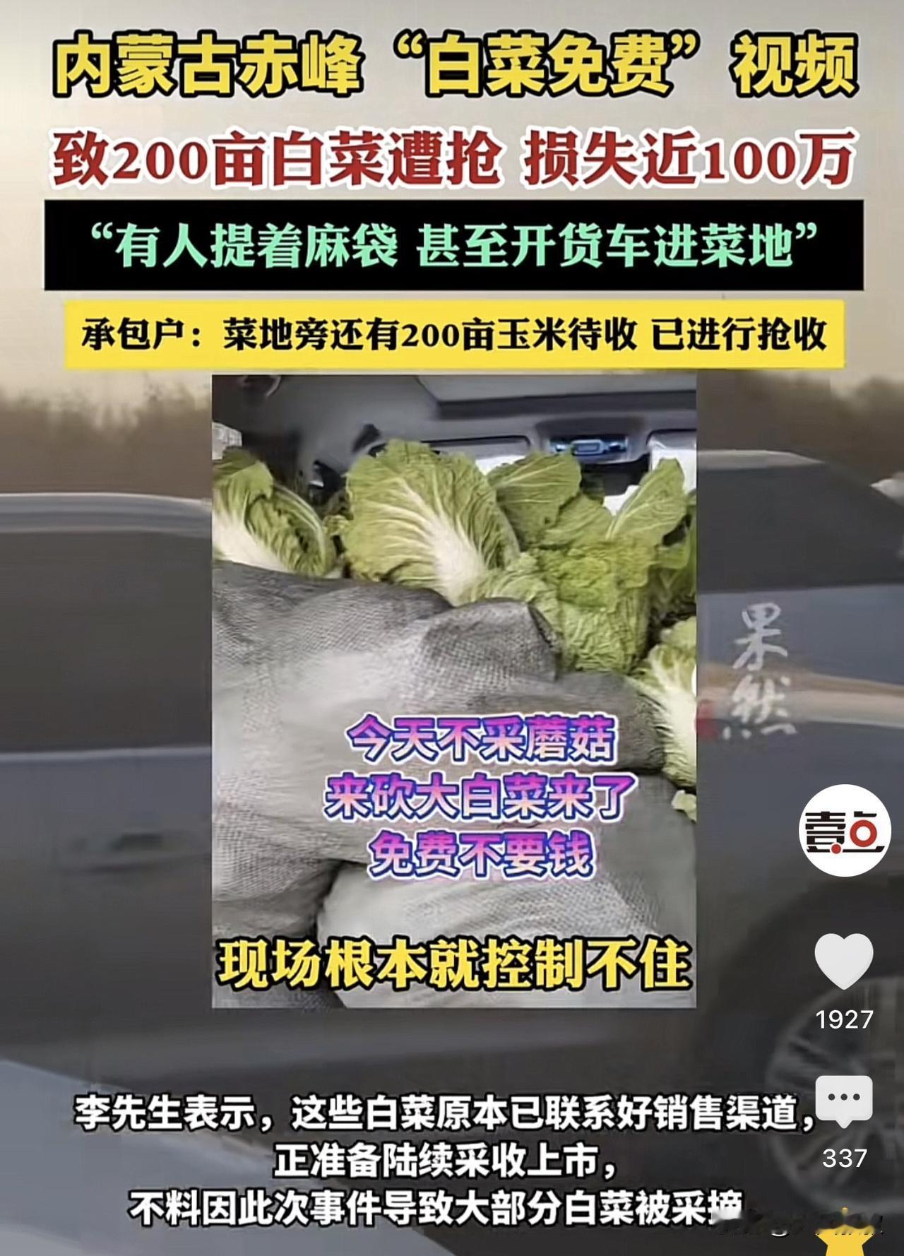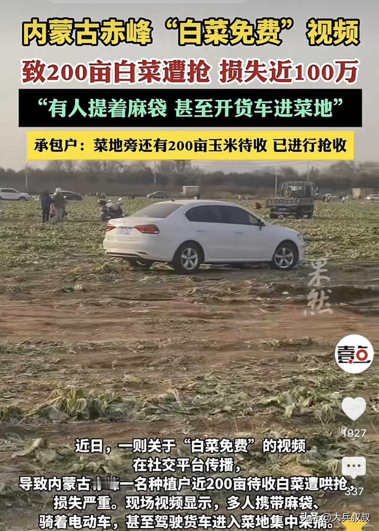 内蒙古赤峰,一种植白菜的农户突然发现,地里来了很多人拔白菜,有人提着麻袋,有人开