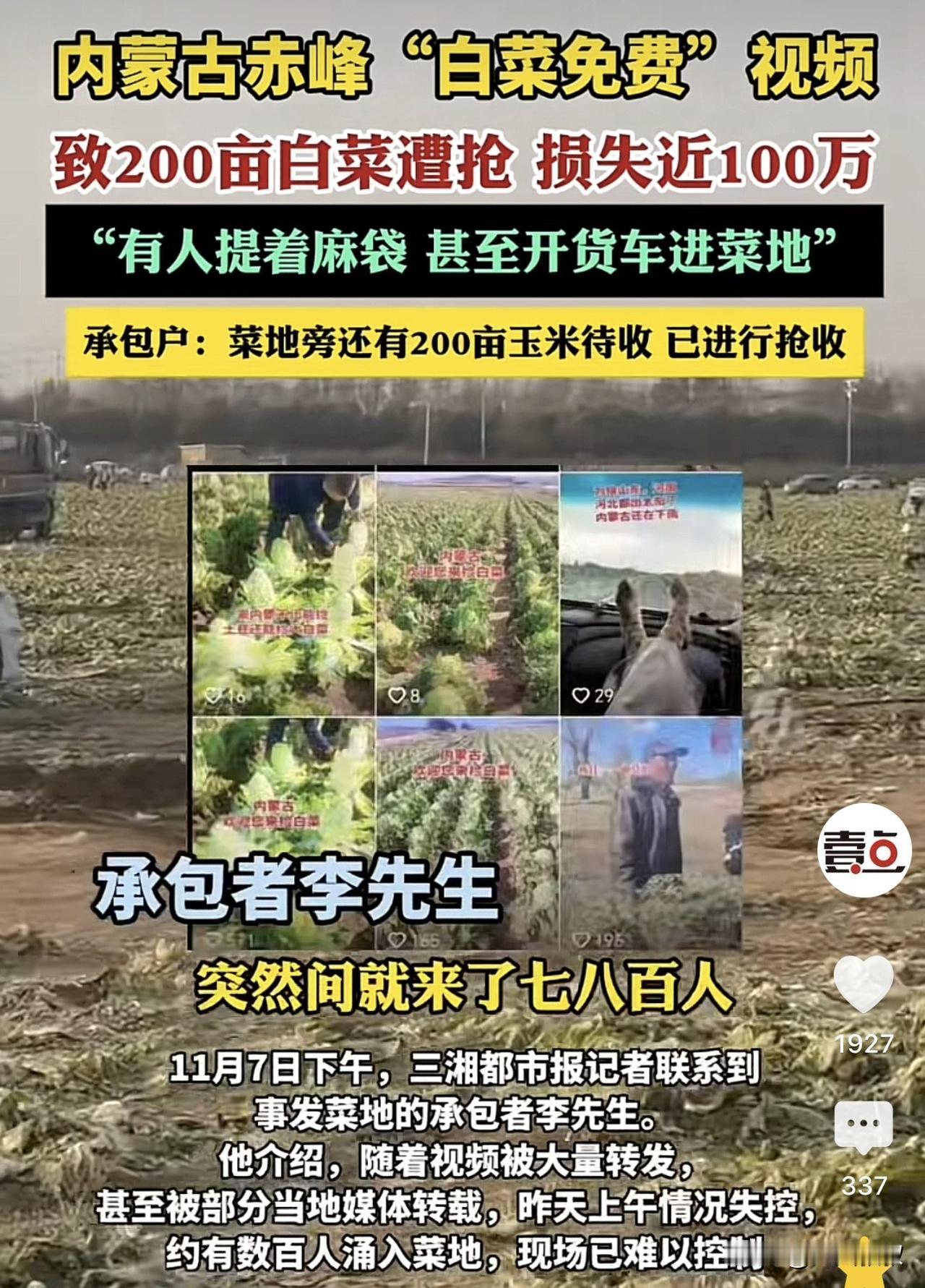 内蒙古赤峰,一种植白菜的农户突然发现,地里来了很多人拔白菜,有人提着麻袋,有人开着货车进菜地,根本制止不过来,200亩的白菜就被这伙人给抢走了,导致自己损失了近100万,而对于哄抢原因更是让人匪夷所思。 据承包者李先生称,自己承包了几百亩的地种植白菜和玉米,事发当天,地里突然来了很多人,有的人骑着电瓶车,有的人扛着麻袋,甚至还有人直接开着货车闯进了地里收割白菜,人数至少有七八百人,根本制止不过来。 原本这些白菜已经联系好了销售商,正准备陆续采收后上市,李先生表示,一亩地损失5000元左右,200亩差不多损失了100万元。 之所有有这么多人来采摘,是因为有人在网上发了白菜免费的视频,随着视频被大量转发,甚至当地媒体也进行了转载,导致情况彻底失控。 目前,当地有关部门表示,以官方通报为准。 有人说,今年白菜4毛钱一斤,一亩地出两千斤才800,你怎么能损失100万?还有人说,白菜一亩地最起码1万斤,我们这里超市1.5一斤,就算从地头收,也是6.8毛一斤,你算算多少钱吧。 也有人说,一定要把造谣的人抓起来,这是罪魁祸首,如果不是他瞎发,人家也不会趟上这个无妄之灾。 那么,发视频的人要不要承担法律责任? 实际上,发视频称白菜免费的行为,如果是他自家地里种的白菜,那么让网友去其家里采摘,那么是没有任何问题的,但是,如果拍摄了李先生的田地,称这块地的白菜免费采摘,让网友看到后把李先生的白菜都采摘完了,那么,发视频的人的行为,其实就属于寻衅滋事行为,即所谓的寻求刺激。 因为发视频的人的行为,客观上导致了李先生损失高达上百万,那么,这算情节特别严重的情形,按照刑法第二百九十三条的规定,行为人或面临五年以下有期徒刑、拘役或者管制的处罚。 而对于哄抢白菜的人来说,如果本身是误以为别人不要了,到地里哄抢,那么这不涉及刑事责任的问题,毕竟是误以为别人不要,而不是有意去抢,所以,在这种情况下,抢白菜的人面临的也只是返还白菜或者支付同等价钱的义务。 但是,如果这些人明知道发视频的人只不过是为了取乐,从而故意去抢白菜的,那么,这种行为就属于抢夺行为,如果数额达到了刑事立案标准,就比如开着货车进来装白菜的,那么一车白菜的数额肯定达到了刑事处罚标准,在这种情况下,是要承担抢夺罪的刑事责任的。 对于不够入刑数额的抢白菜的人来说,同样要按照治安管理处罚法的规定予以处理。 其实,总的来说,来地里抢白菜的人,其实也是明知,人家种的白菜怎么可能会没有要,怎么可能会免费呢,都是揣着明白装糊涂而已。 对此,你对本案有什么看法? —————————— 关注我,带你评析法律热点,关注冷暖人生。 文章原创,抄袭必究
