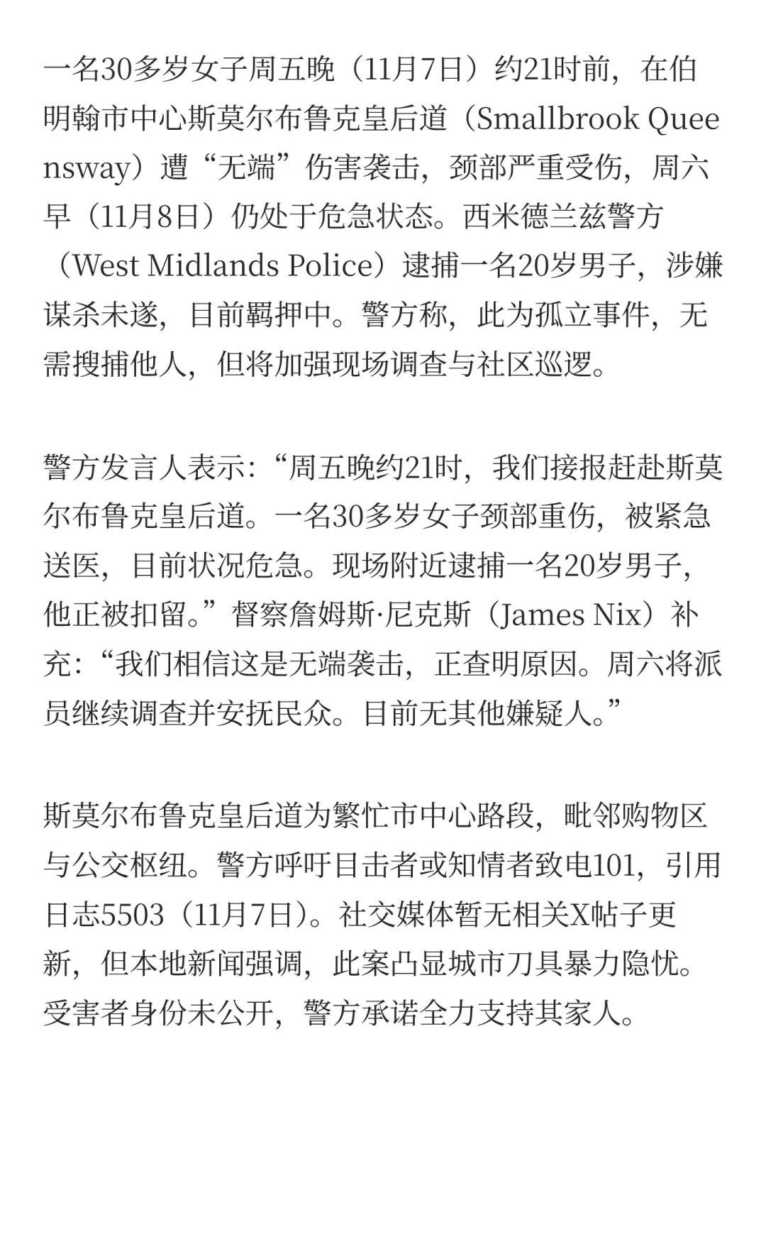 伯村市中心“无端”伤害案30岁女子颈部受伤 曼彻斯特 新闻 生活 伯明翰 英国工作 英国留学生 海外 伦敦生活 伦敦 英国