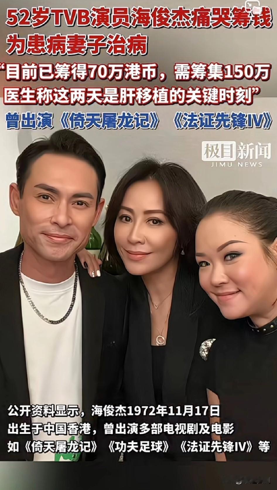 “多谢大家帮忙!”演员海俊杰大哭表示感谢捐款。 52岁TVB演员海俊杰痛哭筹钱,为患病妻子治病:目前已筹得70万港币,需筹集150万,医生称这两天是肝移植的关键时刻! 早期香港配角收入并不高的,他还是不红的配角,后期经济上来,没别的好收入,香港又是高消费地方,没钱很正常,不想大陆一个配角那怕不红,现在收入也不低,做做网红兼职生活很可以的
