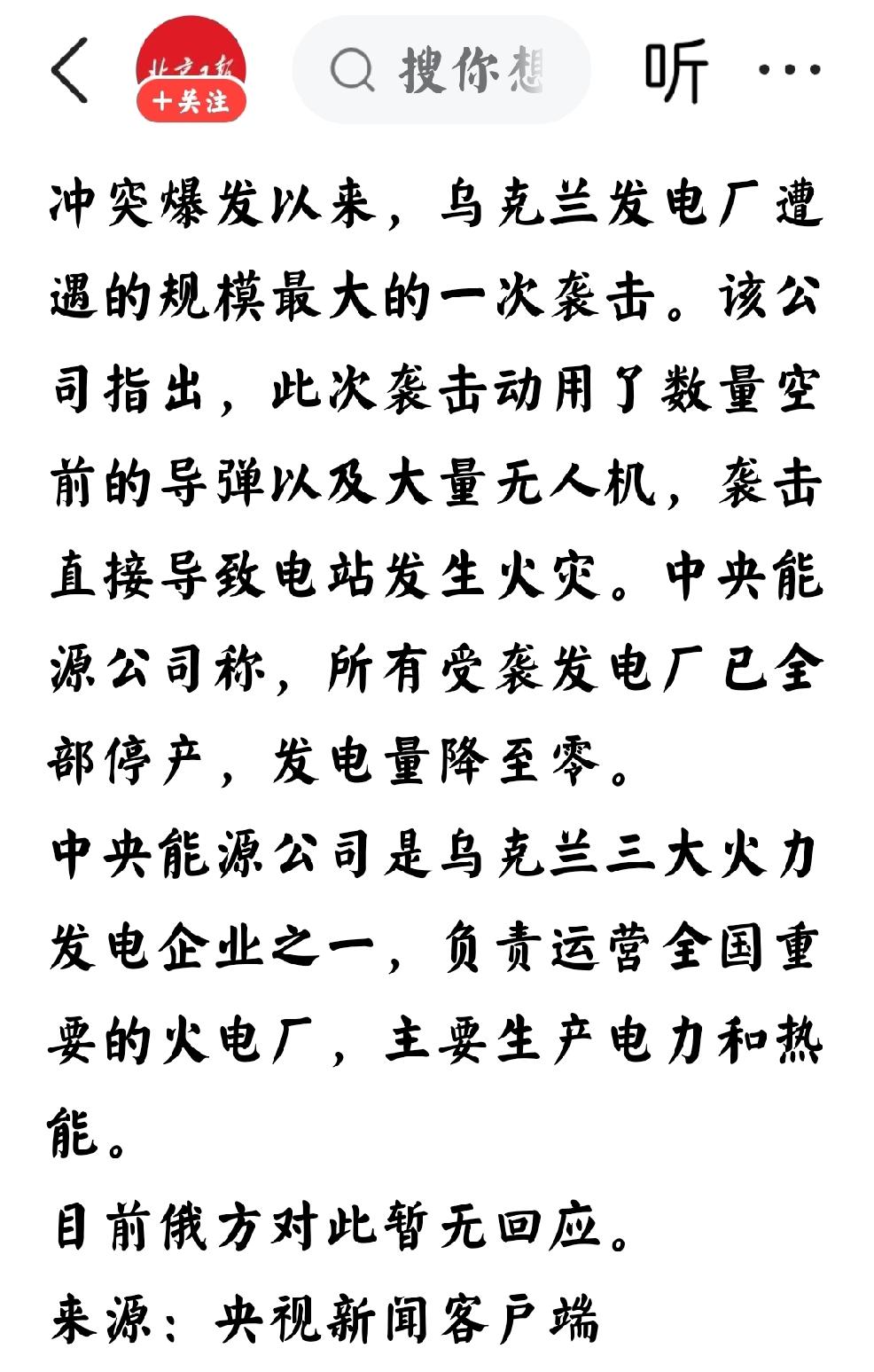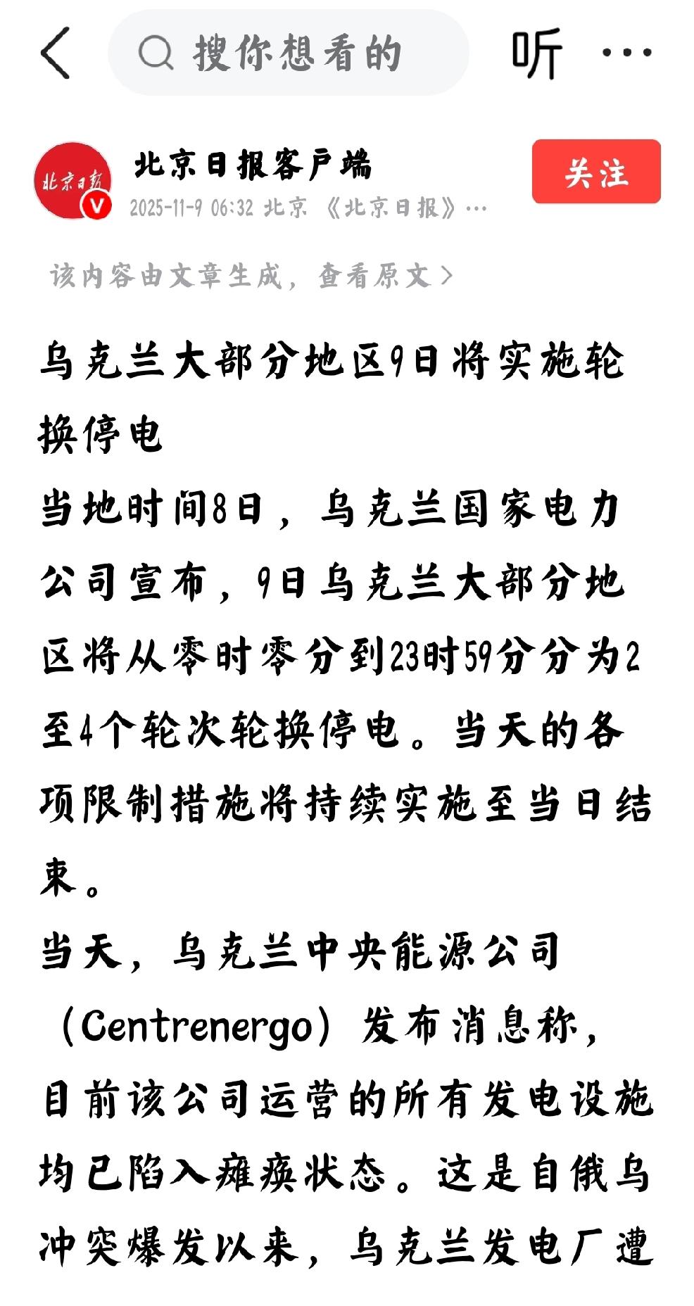 乌克兰实施轮换停电—油尽灯枯? 个人观点:谈判桌上的筹码则是由战场上的战果较量决定。 非常明显,乌克兰大部分地区实施轮换停电,不要忘了现在的季节以及乌克兰的现状,这会引起多方面的连续性的连锁反应。 但是重要的影响则是谈判桌上的筹码。俄罗斯一方又多了一些,那么就意味着乌克兰/美国-欧盟一方的筹码少了一些。个人认为最着急的一方是欧洲。 不着急,让事态进一步发酵,就是那句名言“让子弹在空中飞一会”。