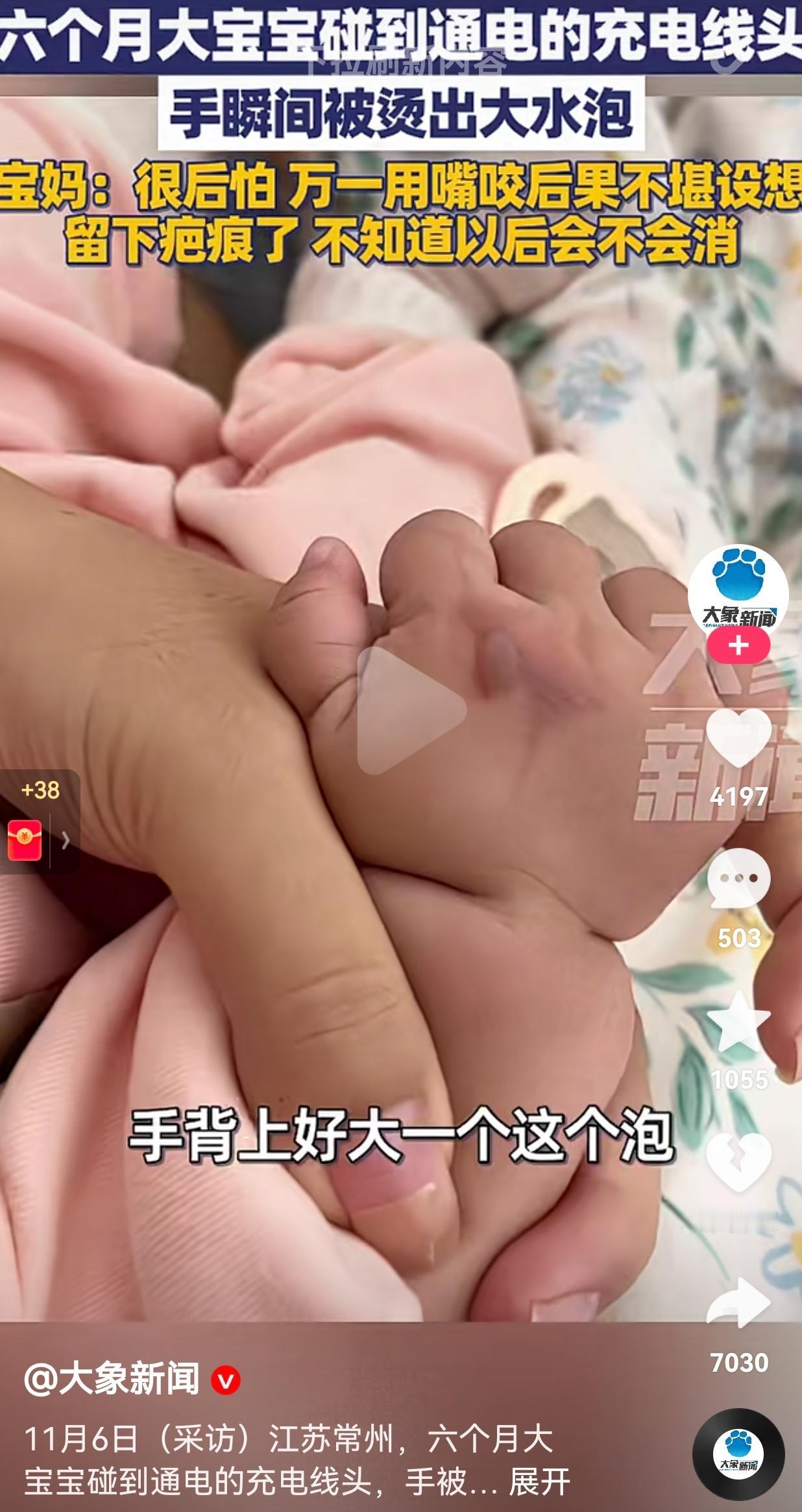 看着都心疼!江苏常州,六个月的宝宝喜欢爬来爬去,这次在床上爬行,无意间手碰到了充电线头。 粗心的家长给手机充完电之后,忘记拔掉了,宝宝触摸到了通电的充电线头。这一碰不得了了,充电线短路了,宝宝的手瞬间被烫出来一个大水泡。 宝宝被这突如其来的烫伤,痛得哇哇大哭!妈妈听到孩子的哭声才知道可能出事了,赶紧看孩子怎么了?这才发现宝宝的手被烫伤了! 不仅如此,就连床上的被单都烧了一个大窟窿。 妈妈看到孩子受伤了,心痛地说道:“真的很后怕,万一用嘴咬,后果不堪设想!现在留下伤痕了,不知道以后会不会消。” 网友看到后评论说,孩子会抓东西的时候,大人就更要在意,我家宝宝现在九个月,一个不注意光拿东西,大人都时时刻刻盯着他的手。不然的话,什么充电器危险东西都乱抓。 还有的网友说,这是什么充电器怎么🈶这么大的危害呢? 手机充电器的电流不是很小吗?怎么会发生这种事情吗?我用了很多充电器,也摸过充电器的电线头,根本不会出现这种情况。 看来家里有孩子的,一定要注意孩子的安全,有潜在危险的东西一定要做好防护,把危险的物品放到孩子找不到的地方,把危险扼杀在摇篮里。 大家觉得呢?欢迎大家评论区讨论留言。