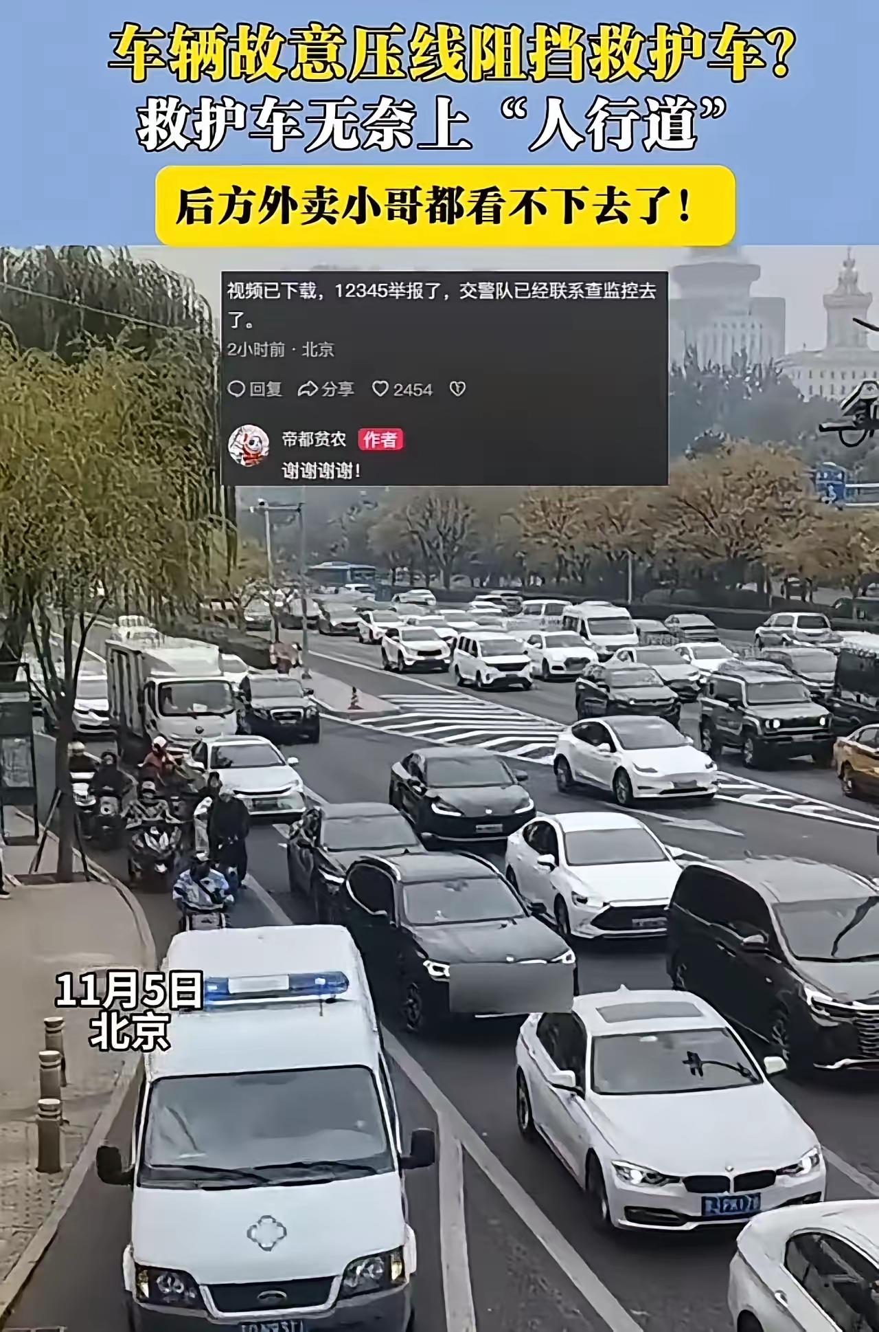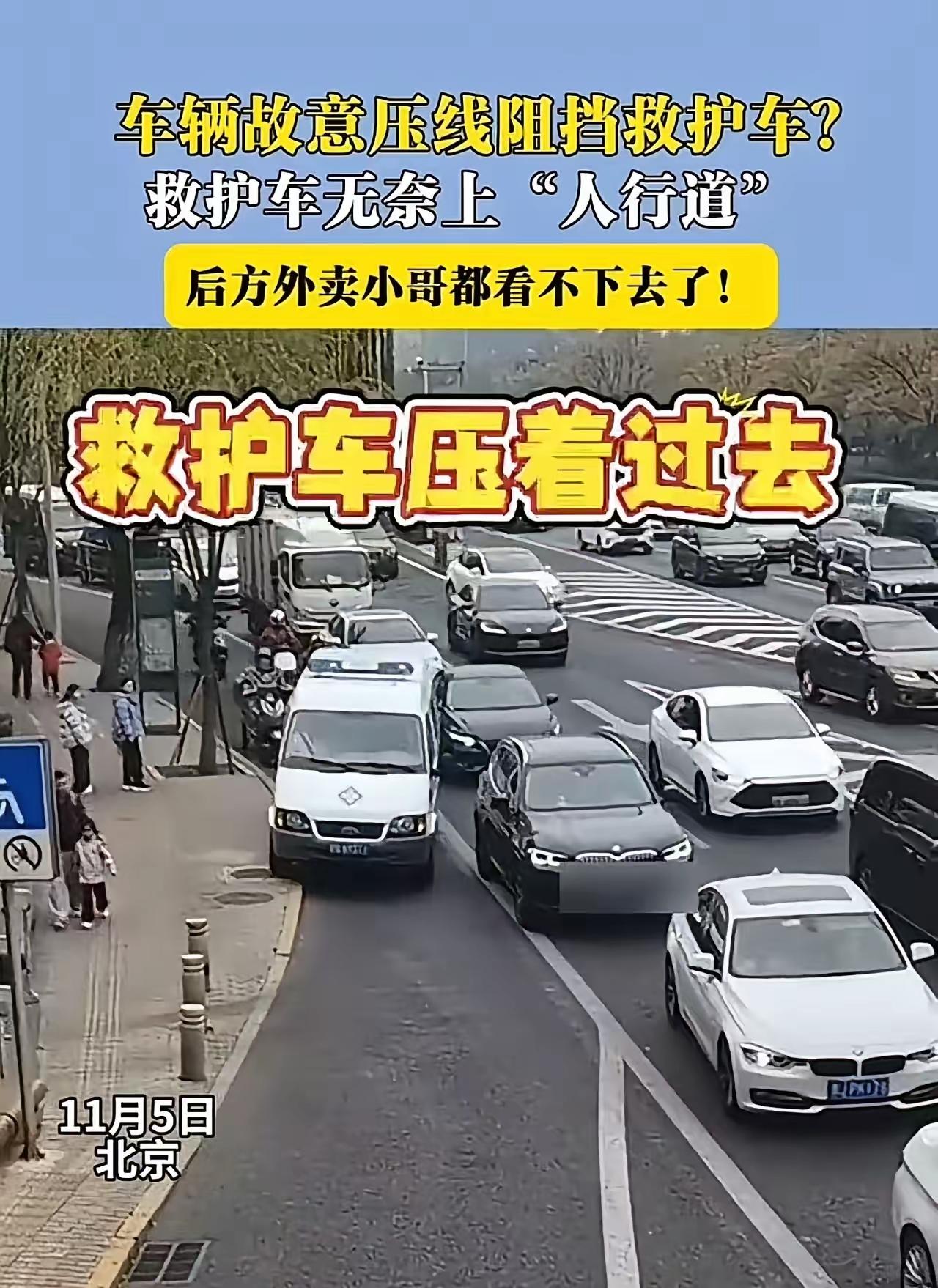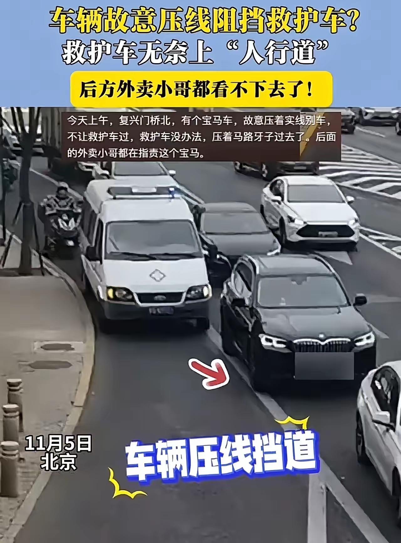 开宝马就敢堵生命通道?这操作真够缺德的! 我刷到这视频时气得直骂街,北京街头救护车警笛都快喊哑了,那宝马司机愣是压实线卡着不动,跟没听见似的!救护车司机急得直拍方向盘,最后没辙只能骑上路肩,车轮碾着马路牙子颠颠往前冲,看着都揪心。 更气人的是,救护车刚挤过去,他立马打轮回实线,动作溜得不行,明摆着故意的!后面骑电瓶车的都看不过去,换我我也得忍不住吐槽。 监控拍得清清楚楚,这哪是没注意,就是没把别人的命当回事。开豪车也不能丢了良心,这种阻碍急救的行为,难道不该重罚以儆效尤?开救护车 拦救护车 逼停救护车