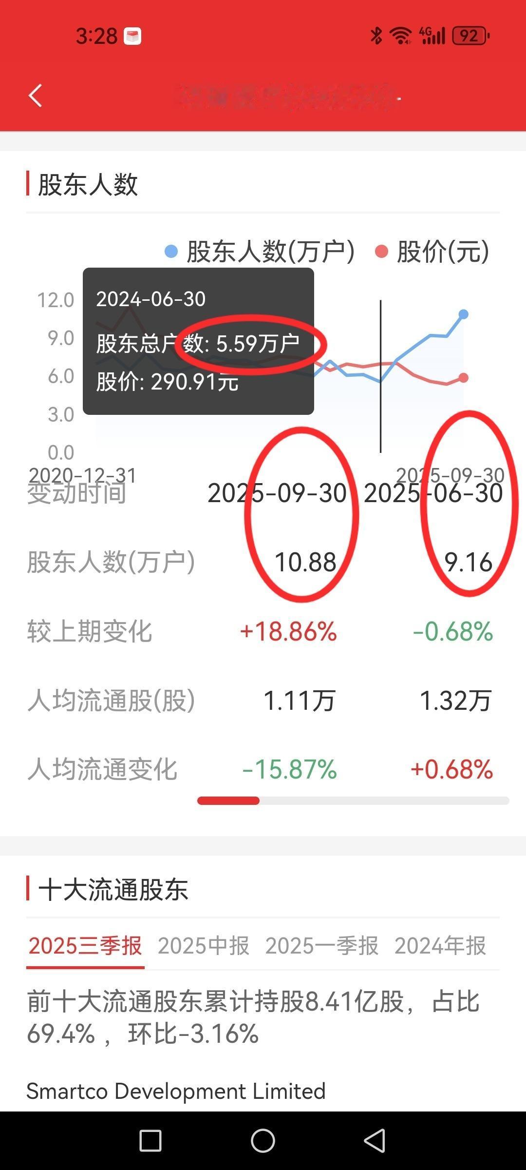 迈瑞医疗,散户蜂拥抄底,咋个能涨? 三季度,股东人数增长了18.7%,对应附图一的A点到B点这个区间,三季度末股价245.69元。结果节后一路杀跌到现在的205.79元,跌幅达到16%,抄底散户全被闷进去了。 如果拉长时间看,你会惊奇发现散户抄底始于2024年三季度开始,二季度末股东人数仅仅为5.59万户,对应股价为290元,至三季度末股东人数达到10.88万户,翻了近一倍,股价却跌了15.5%,然后进入四季度再跌16%。 这不仅让我联想当2023年隆基绿能的情况,当初股价在26~28元阶段股东人数达到95万户的高峰,结果股价再次腰斩跌到12元多。现在股东人数最低减到近70万户,股价也才构筑出一个底部回升形态。 所以,仅从筹码分布情况和股价变化情况就能看出迈瑞医疗未来构筑底部都需要一个较长的时间,短期要指望些什么完全不显示。