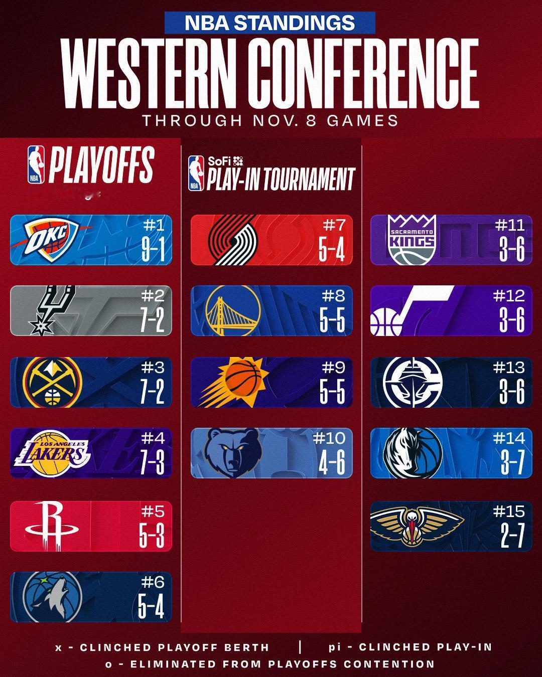 11月9日NBA战绩排名: 东部前六: 1—活塞7-2 2—骑士7-3 3—76人6-3 4—雄鹿6-3 5—公牛6-3 6—尼克斯5-3 西部前六: 1—雷霆9-1 2—马刺7-2 3—掘金7-2 4—湖人7-3 5—火箭5-3 6—森林狼5-4 东西部各有一支球队让人惊喜,东部是活塞,在坎宁安的带领下,活塞现在是东部领头羊,别看东部老手众多,但活塞这帮新人可不是吃素的,定能搅乱东部。 西部马刺这赛季妥妥的大黑马,文班亚马超计划,再加上福克斯复出,马刺的即战力在西部名列前茅,毕竟每支球队都很惧怕文班亚马,看文班这赛季能将马刺带到什么高度吧。