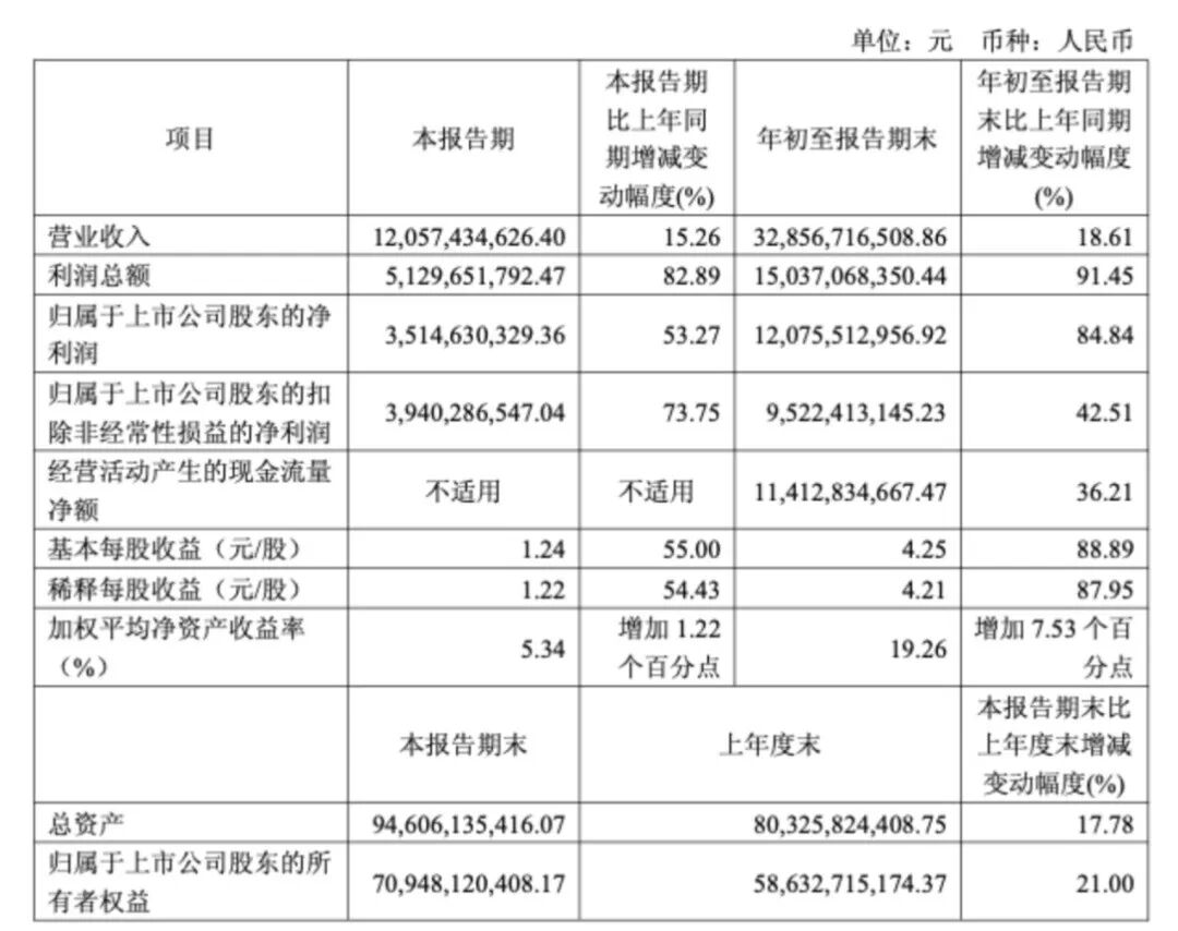 利润端表现更为突出,前三季度归属于母公司股东的净利润为120.8亿元,同比增长84.8%。