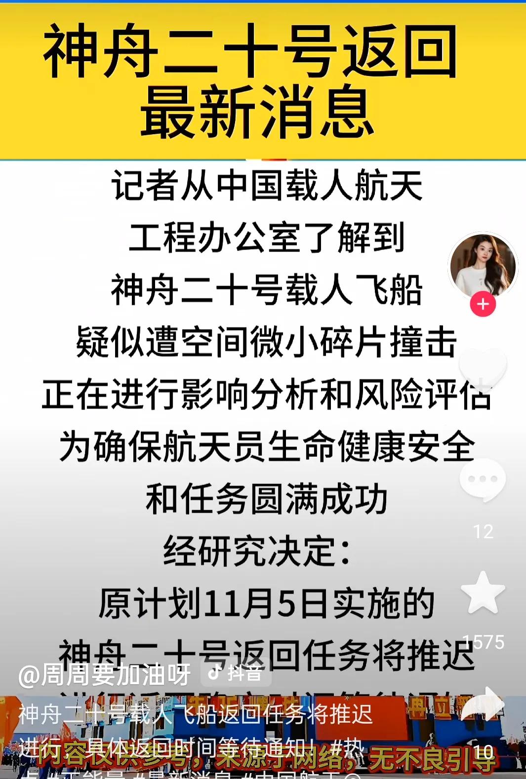 神舟二十号返回推迟!并非爽约,3毫米太空碎片成关键,乘组状态引关注 神舟二十号这几天怎么样了,原来不是说七十二小时评估后决定,八号返回吗?昨晚守了一晚电视,怎么官媒一点消息都没有! 其返回推迟因遭遇毫米级太空碎片撞击,服务舱出现3毫米凹痕,可能影响再入安全。 乘组状态良好,地面团队经超算10万次模拟、三级评审后,以安全为首要原则调整计划。 官媒未即时通报,是因需整合多系统数据,确保信息准确,避免引发不必要猜测。 航天任务的谨慎延迟,恰是对生命的敬畏与技术的严谨,耐心等待官方通报,就是对航天员与航天工程最好的支持。