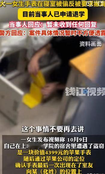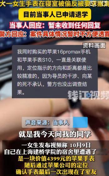 上海一高校惊现离谱事!大一女生宿舍4399元苹果手表被盗,凭定位锁定室友,辅导员却阻挠报警、反逼她搬离,最终女生无奈退学,还被扣除5千余元费用,引发全网热议! 浦东公安分局调取的苹果设备定位日志里,有两组关键信息始终清晰:2025年10月9日15时01分,上海建桥学院302宿舍大一学生林晓薇的苹果手表,最后一次上传位置落在室友向某床铺3米范围内。 这是林晓薇10月12日报警后,警方通过法定程序从苹果公司获取的核心线索,也是整个事件中最明确的物证。 在此之前,林晓薇已为这块手表的去向奔波了3天。 这块价值4399元的手表,是她高考后在社区超市做理货员,每天工作13小时攒下32天工资所买,表盘背面刻有母亲生日,还绑定了紧急联络功能。 10月9日18时30分,她从自习室返回宿舍,发现手表从床头收纳盒中消失,翻遍宿舍无果后,在室友提醒下登录“查找”APP,看到了上述定位记录。 向某是9月28日通过宿舍调整转入302室的,当时宿管仅告知“新同学入住”,未提及其他背景。 直到手表失窃,室友小李才私下透露,曾在食堂听闻向某原寝室同学吐槽,她此前偷过200元现金和一套兰蔻化妆品,最后由家长赔偿才平息,未受学校处分。 林晓薇带着定位截图找到辅导员王某核实,王某直接承认知晓向某前科,却以“报警会毁她前途”“学校处理更快”为由,多次阻挠报警,还强调“定位不算直接证据”。 10月10日至12日,林晓薇每天追问处理进度,王某始终以“联系家长中”“向某不承认”搪塞,甚至提议“学校给500元补助,这事算了”。 担心定位日志7天失效,林晓薇10月12日自行报警,此举立刻引发王某不满。 王某当天电话质问她“不顾学院‘平安校园’评优”,还威胁“以后助学金、评优别想了”。 10月13日早,王某在宿舍群发通知,要求林晓薇及另外两名“与向某有矛盾”的室友,18时前搬至4号楼临时宿舍,逾期按“违反宿舍规定”处理。 林晓薇在群里质疑“为何偷东西的人不搬”,未获回应,反而在17时30分遭遇宿舍断电。 当时室友小李正在撰写未保存的课程论文,林晓薇手机仅剩12%电量,两人只能借走廊应急灯收拾行李。 当晚,林晓薇提交退学申请。 10月14日办理退学手续时,财务处出具的扣费单显示金额5330.6元,明细包含学费3200元、住宿费1800元、学籍管理费200元、体检费130.6元。 林晓薇提出异议:她9月8日报到,10月13日退学,扣除14天军训、6天周末,实际仅上课4天。 按教育部《高等学校收费管理办法》“按实际学习时间折算学费”的规定,扣费金额明显不合理。 但财务人员仅以“学校统一标准”回应,未提供折算依据。 退学后,林晓薇留在学校附近等待调查结果。 警方告知她,宿舍楼道监控显示向某独自返回宿舍,15时10分离开时手持黑色小袋,尺寸与手表包装盒吻合。 后来,林晓薇向上海市教育局提交书面投诉,附带王某阻挠报警的通话录音。 11月4日,学校办公室联系她,提出“退还2000元撤投诉”,被拒绝。 事件登上热搜后,学校发布通报:暂停王某学生管理职责,全额退还5330.6元,计划建立“问题学生宿舍调配备案制度”。 值得注意的是,2025年8月广州某高校曾发生类似事件:一名学生的大疆无人机被盗,定位指向室友后,辅导员当天陪同报警,3天内通过监控和定位证据查清事实,涉事学生被记过处分,无人机被追回,学校还为失主安排了落课辅导。 两起事件的处理方式形成鲜明对比,也凸显出上海建桥学院在学生权益保护与事件处理中的明显疏漏。 截至事件引发关注时,林晓薇的苹果手表仍未找回,警方表示将继续围绕定位轨迹与监控线索开展侦查。 而林晓薇手机里保存的定位日志截图、扣费单据、通话录音,至今仍是她维权的核心依据。 这些真实材料,也完整还原了一名大一学生在遭遇失窃后,权益接连受损的全过程。   如果各位看官老爷们已经选择阅读了此文,麻烦您点一下关注,既方便您进行讨论和分享,又能给带来不一样的参与感,感谢各位看官老爷们的支持!