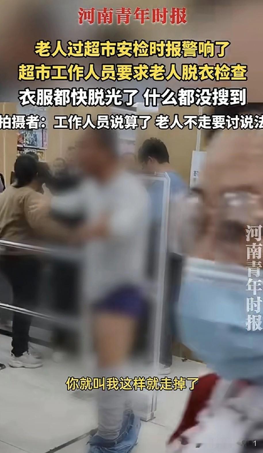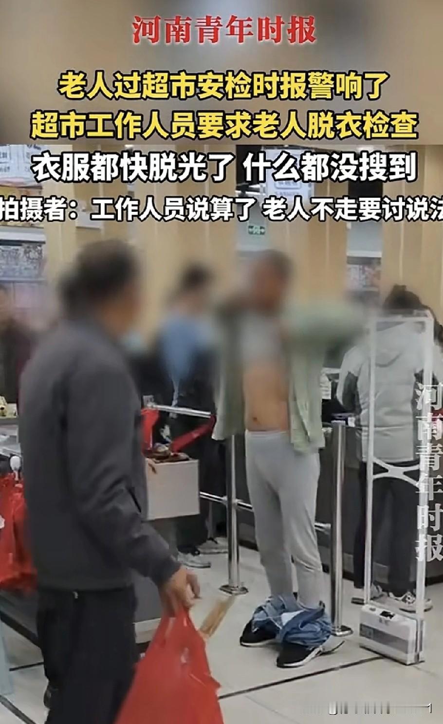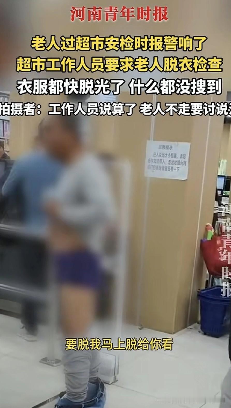 老大爷到超市购物,转了一圈,没找到想买的东西,觉得没啥可买的,便从出口离开。可经过超市安检时,警报响了。老大爷满心疑惑:我啥都没拿,咋就响了呢? 超市工作人员把老大爷拦住,怀疑他身上藏着未付款的商品,要求他脱衣服检查。老大爷哪肯愿意,付款台前那么多人,咋能脱衣服呢?但工作人员不依不饶,就是不让老大爷走。 为了自证清白,老大爷先把牛仔裤脱到脚脖处,露出衬裤,再次过安检,机器依旧响个不停。老大爷问工作人员怎么办,工作人员说算了,让老大爷走。可老大爷哪能就这么走,这脸都丢尽了,脾气也上来了。他接着脱上衣再过安检,机器还是响。他又把衬裤脱到膝盖处,将衬衣掀到胸口,再次走向安检机器,警报依旧响起。老大爷激动地质问工作人员:“裤衩子要不要脱?要脱我马上脱给你看!”工作人员一个劲儿地说“算了算了”,让老大爷走。 到了这地步,哪是一句“算了”就能了事的,老大爷岂能白白被冤枉?奇怪的是,都检查到这份上了,工作人员还不怀疑机器有问题,还在对老大爷搜身,他们哪来的底气?这不过是家日用品超市,又不是珠宝行,能藏什么值钱的东西。 超市此举太侮辱人了,让人家脱衣服检查,却啥也没搜出来,人家自然要个说法,哪能一句“算了”就打发了,赔礼道歉和赔偿肯定少不了。老大爷说:“我不会走的,你说脱我就脱啊,我不要面子的吗?”他说得在理,不把超市领导叫来把事情说清楚,他坚决不走。 对此大家怎么看?