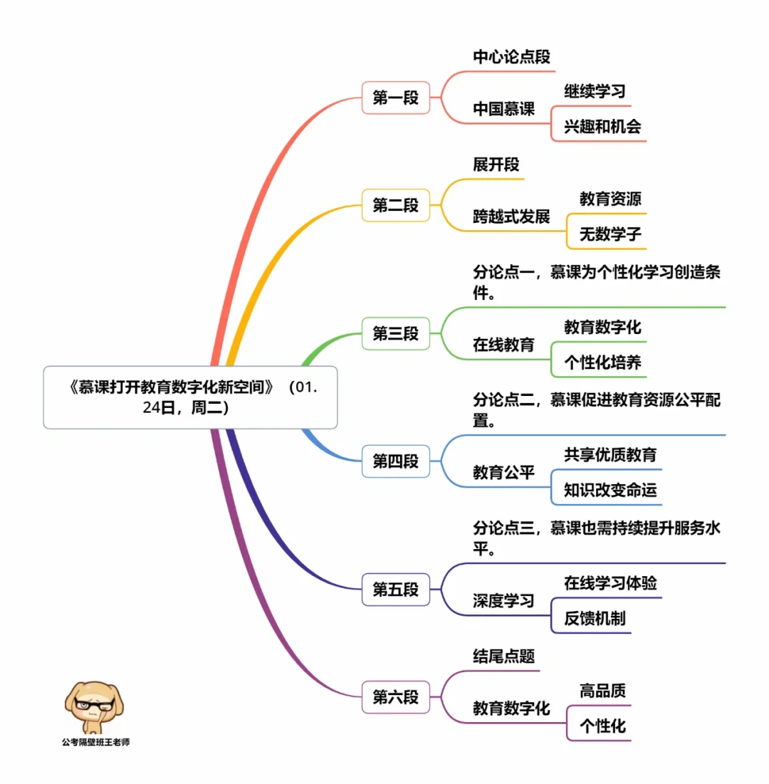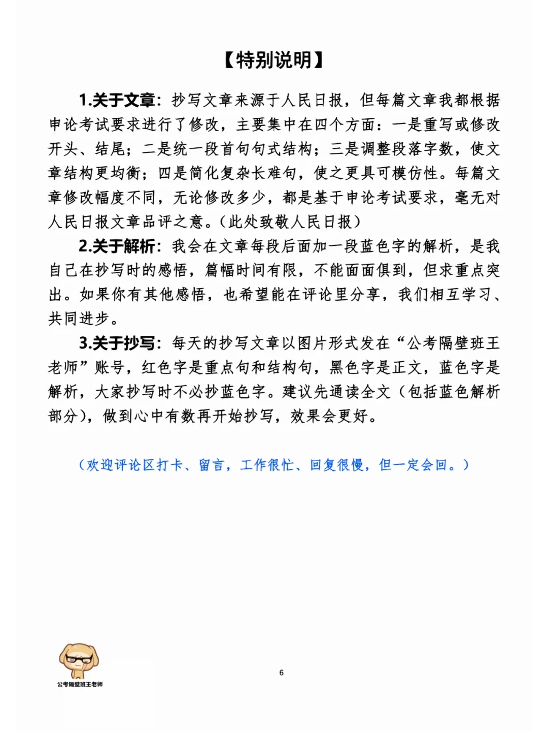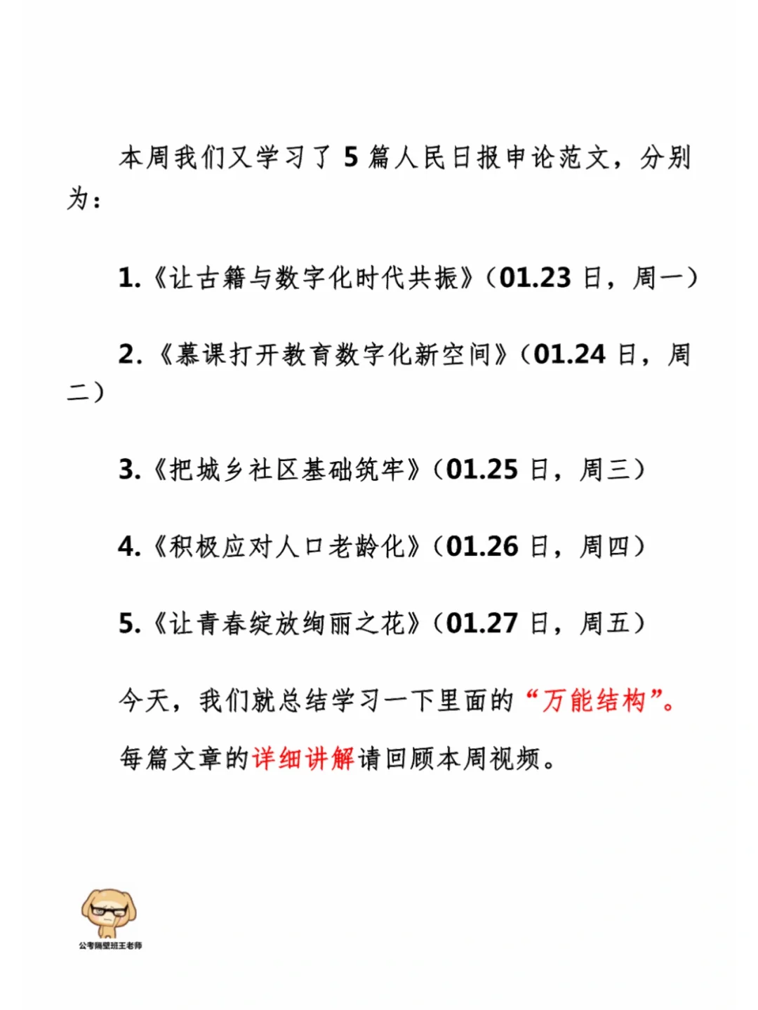 本周我们又学习了5篇人民日报申论范文,分别为: 1.《让古籍与数字化时代共振》(01.23日,周一) 2.《慕课打开教育数字化新空间》(01.24日,周二) 3.《把城乡社区基础筑牢》(01.25日,周三) 4.《积极应对人口老龄化》(01.26日,周四) 5.《让青春绽放绚丽之花》(01.27日,周五) 今天,我们就总结学习一下里面的“万能结构”。 每篇文章的详细讲解请回顾本周视频。 ⭐ ⭐ ⭐ ⭐ ⭐ ⭐ 这里是公考隔壁班王老师独创的“每天半小时・申论80分”抄写团,欢迎加入我们!