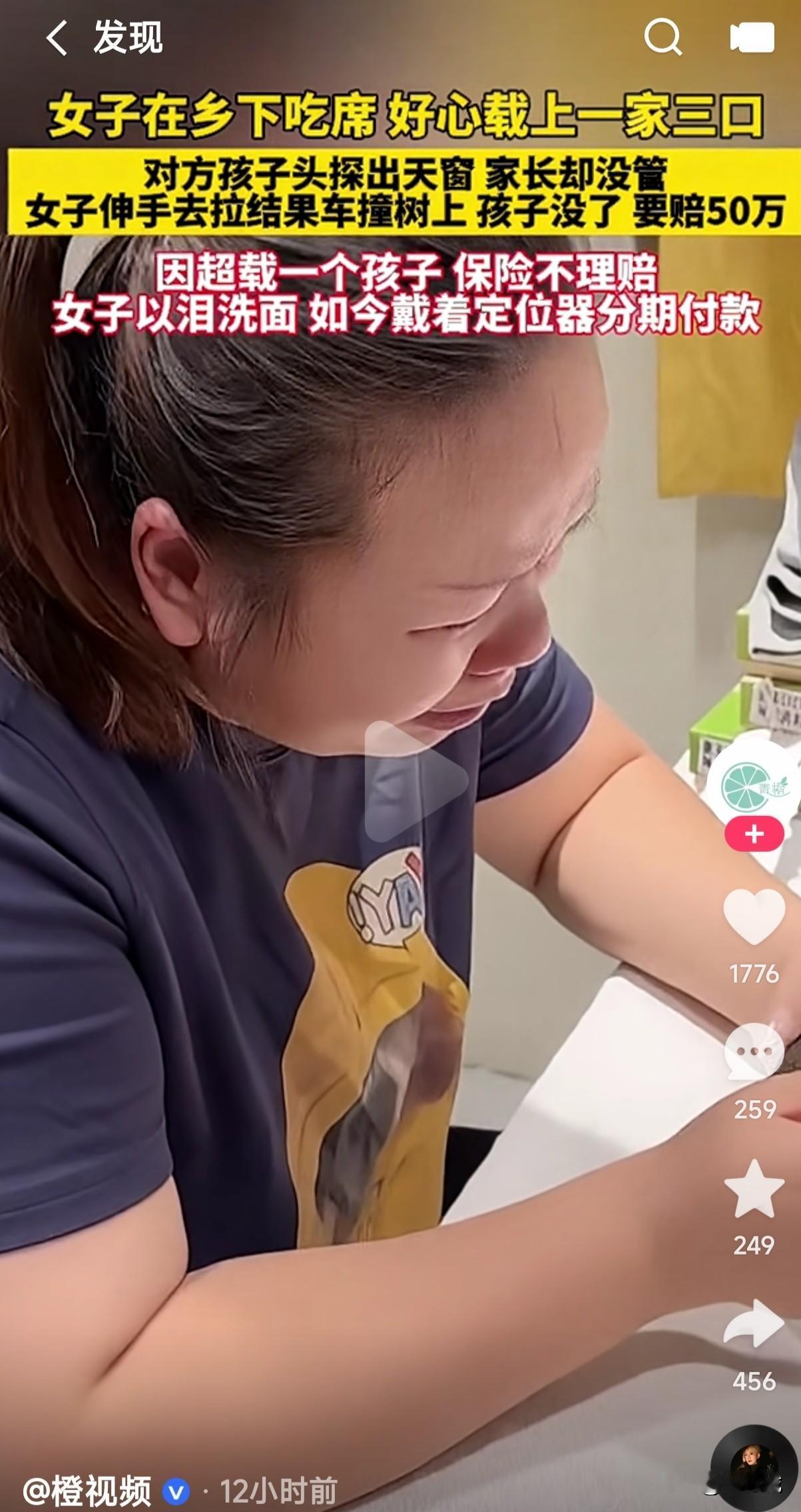 女子乡下吃宴席好心载上一家三口,对方孩子探出窗外家长没管,女子伸手去拉车撞树上孩子没了赔50万,因超载一个保险不赔,如今戴着定位器分期付款。 好人真的就那么难做吗?不是说好人都有好报吗?只因一个善意的举动拉上一家三口,没想到熊孩子调皮把头伸出窗外,而不负责任的家长也不管,任由孩子所作所为,谁能想到女子伸手拉孩子时结果车撞树上了,孩子也没了,这到底是谁的责任,到底是家长没有尽到看护的责任?还是这女子低估了人性? 然而因为超载一个的原因,保险居然不理赔,女子如今只能自己戴着定位器分期付款来赔偿,就是整日以泪洗面又有什么用呢?自己的好心举动却没想到害了自己,这好人以后还能做吗?