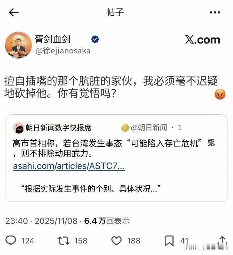 “斩首说”引爆日本! 日前,针对日本新首相高市早苗声言如果台湾有事,日本将动用武力干预,中国驻日本大阪总领事薛剑在社交平台评论:“只能毫不犹豫地斩掉那擅自闯入的肮脏头颅。你已经做好心理准备了吗?” 中国外交官的“斩首说”,在日本国内无异于引发一场核爆,各方言论纷沓而至:“外交官扬言砍下日本首相的头,这已是对主权国家宣战了。”“这位外交官应该被驱逐出境。”“这个人在日本已经构成了对日本安全的威胁了。” 看得出薛剑的评论戳到了日本的痛处,明明是中国的内政,日本非要横插一脚,公然挑衅中国的主权,还不允许中国提出抗议,以为中国还是上个世纪前半叶可以任人宰割凌辱的中国吗?! 日本如果不能正视历史与现实,执意挑战中国的底线,不排除中国会出手予以惩戒,日本最好不要错判中国维护主权与领土的意志决心,当下,还只是薛剑的口头警告,如果付诸武力,日本与高市早苗承担得了吗?