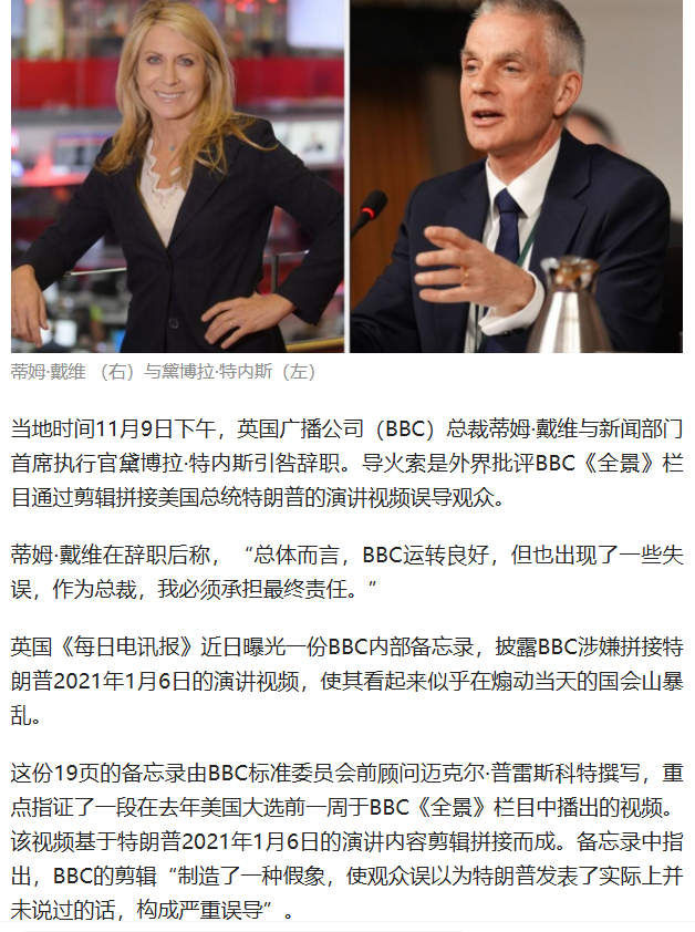 【#因剪辑拼接特朗普视频BBC高管辞职#】当地时间11月9日下午,英国广播公司(BBC)总裁蒂姆·戴维与新闻部门首席执行官黛博拉·特内斯引咎辞职。导火索是外界批评BBC《全景》栏目通过剪辑拼接美国总统特朗普的演讲视频误导观众。