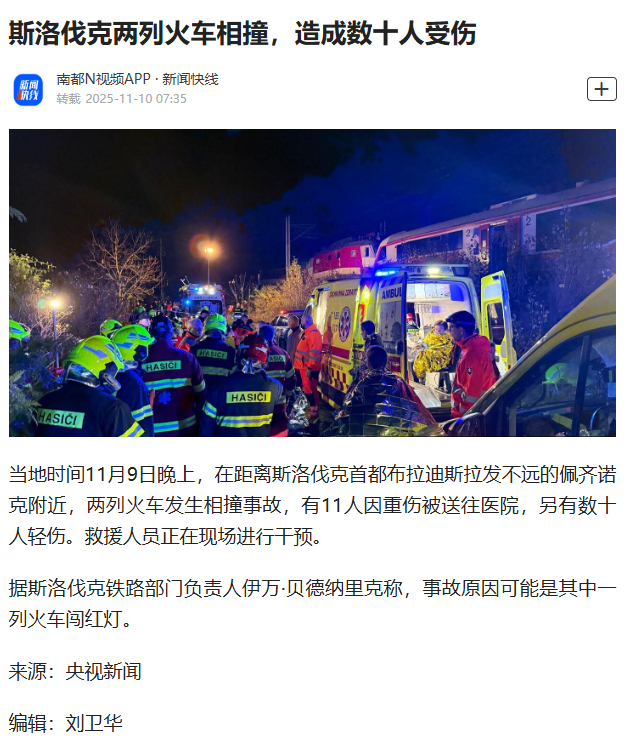 #斯洛伐克两火车相撞数十人受伤#【斯洛伐克两列火车相撞,造成数十人受伤】当地时间11月9日晚上,在距离斯洛伐克首都布拉迪斯拉发不远的佩齐诺克附近,两列火车发生相撞事故,有11人因重伤被送往医院,另有数十人轻伤。救援人员正在现场进行干预。