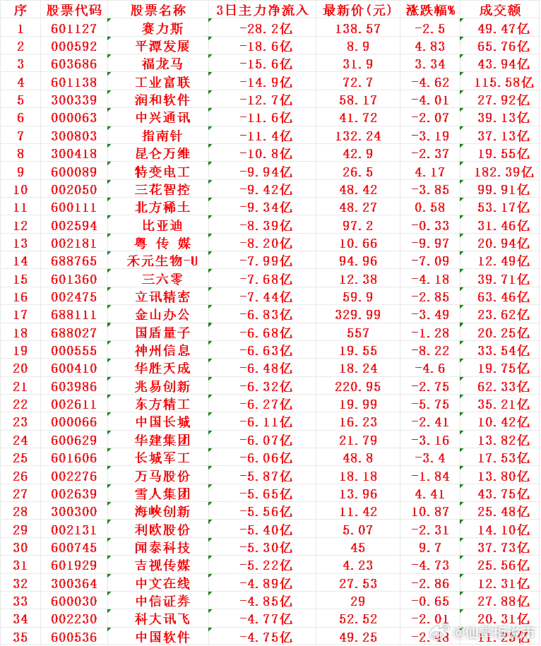 当心!11月10日,前3天主力大幅卖出的35名单赛力斯:3日主力净流出28.2