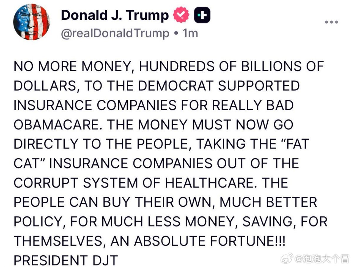 川普总统呼吁:“把奥巴马医改的数十亿美元给人民,而不是给保险公司!”