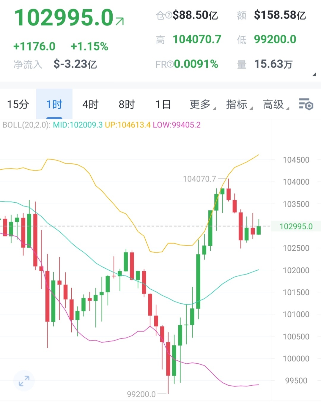 昨晚受宏观经济情绪的影响,美联储可能放缓降息的信号推动市场走强,大饼一度震荡下行再次10W关口虽跌破但未有效延续随后回暖。丝露中也明确给到104000的空行情如期一路跌破10W,随后99600抄的哆隔夜如期拉回104000附近起跌,两波共近8000點空间波段吃的爽歪歪。