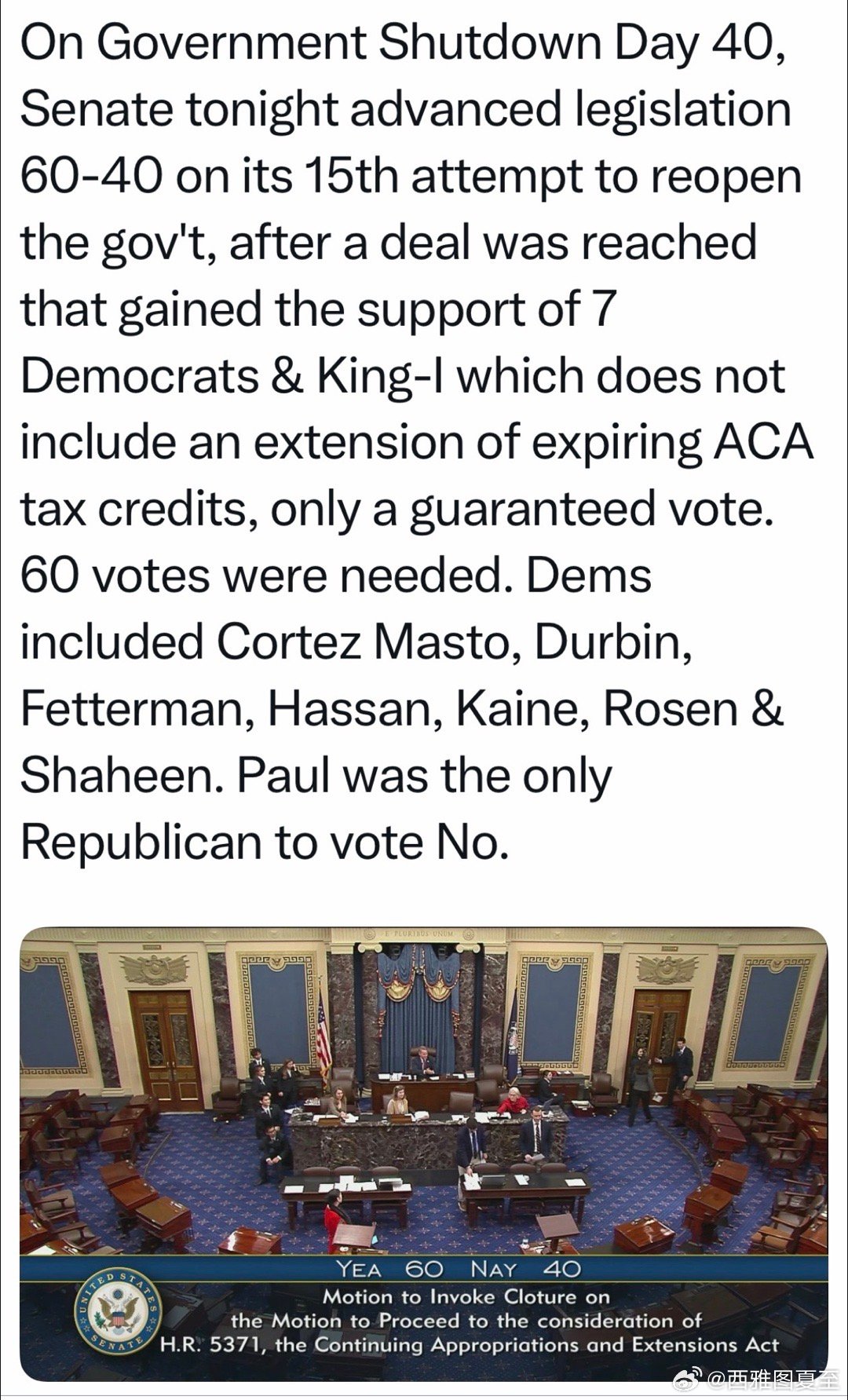 政府关门第四十天,参议院60-40通过临时拨款法案