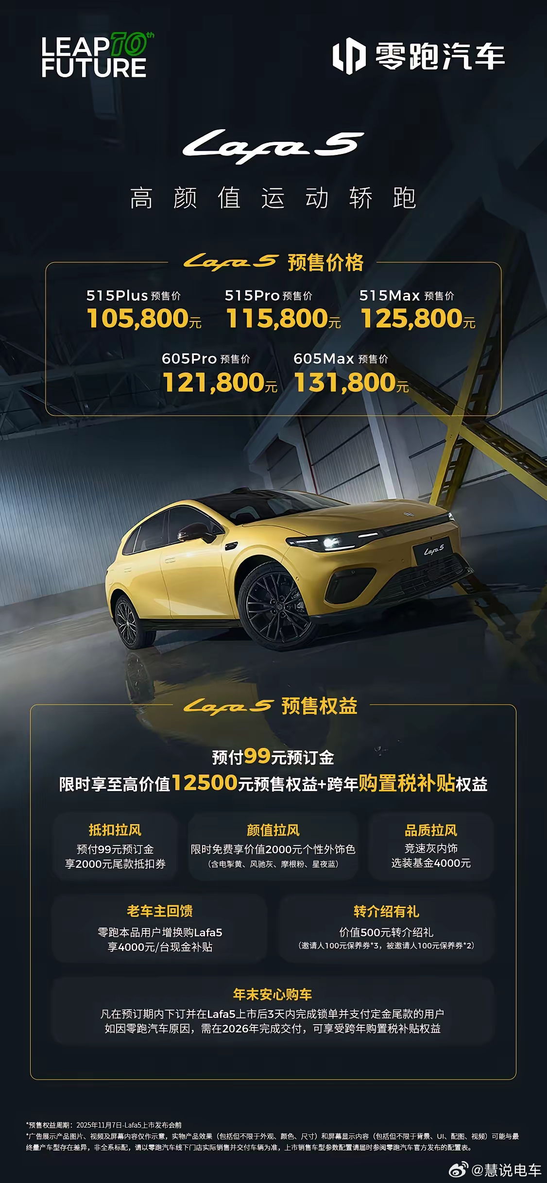 我想,绝大多数年轻人都想选择后者,说到这样的车型,那不得不说一下零跑推出的全新个性化战略新品——Lafa5,目前,这台车已经开启了预售,预售区间为10.58万-13.18万,还有预付99元预订金,限时享至高价值12500元预售权益,以及享受跨年购置税补贴等。