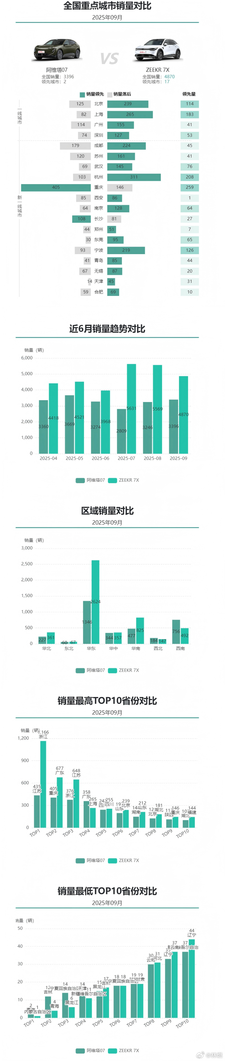 2025年9月,极氪7X卖了4870辆,而阿维塔07的销量要低一个量级。更关键的是城市覆盖,极氪7X在17个重点城市实现销量领先,而阿维塔07只在1个城市占优。这说明在主流消费区域,极氪7X的渠道力和产品认知度明显更高,而阿维塔07的市场影响力还非常局部。