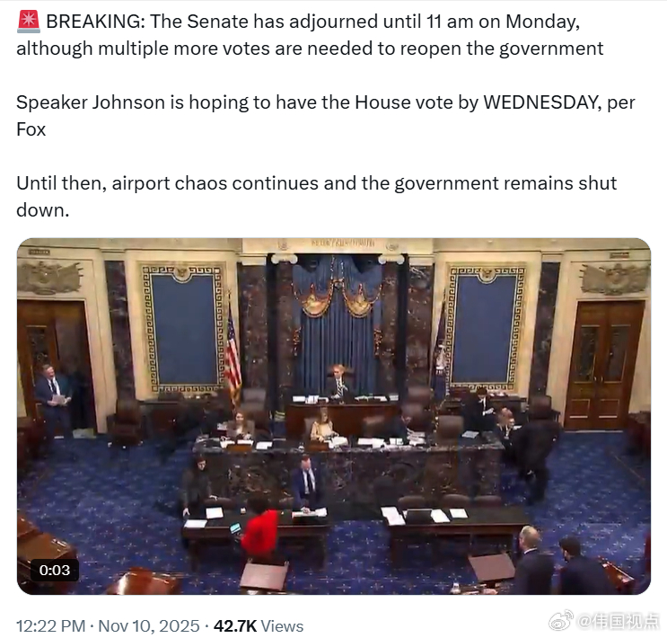 参议院已休会至周一上午11时,尽管仍需多项额外投票才能重新开放政府。
