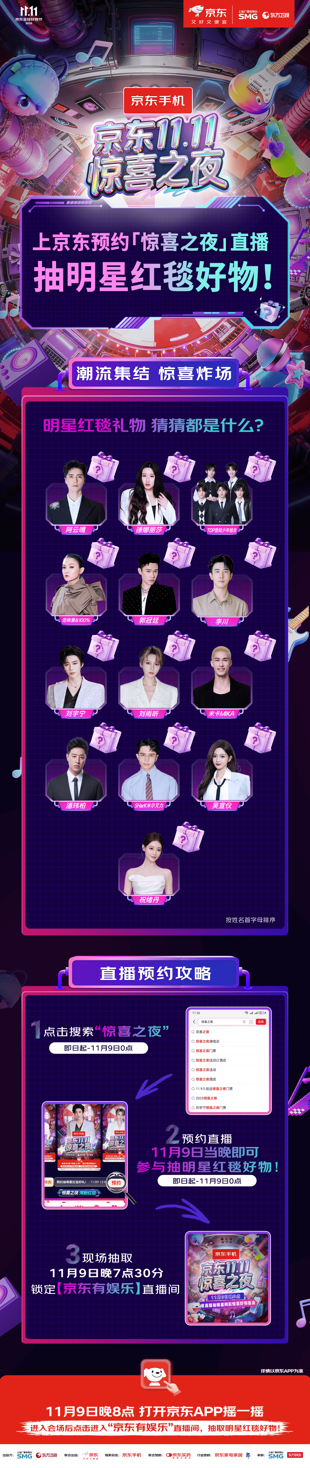 科技党狂喜!京东 11.11 惊喜之夜藏双重福利~真正的11.11从11月9日晚8点开始!京东11.11 连续3天 终极放价更便宜!2351元补贴,人人可领!11月 9日晚7:30打开京东 APP 摇一摇进会场,点 “京东有娱乐” 直播间抽明星红毯礼物,9 号 0 点提前预约才能参与~商务同款在青春采销直播间可冲,家电直降千元 + 1 元秒杀超香!京东惊喜之夜发黄金钻石手表1111惊喜之夜京东11.11惊喜之夜京东11.11 又好又便宜真正的11.11明晚8点京东开始
