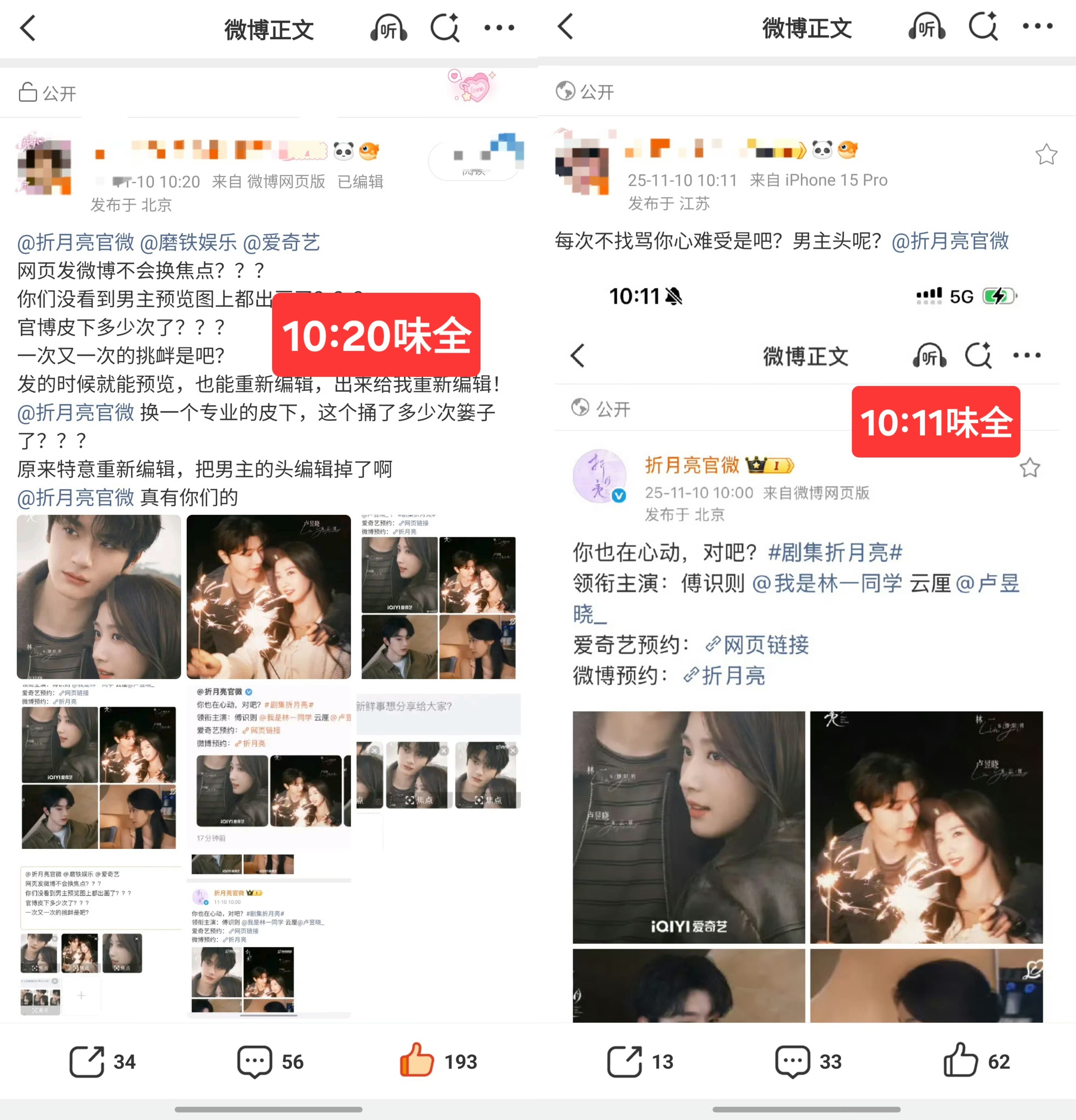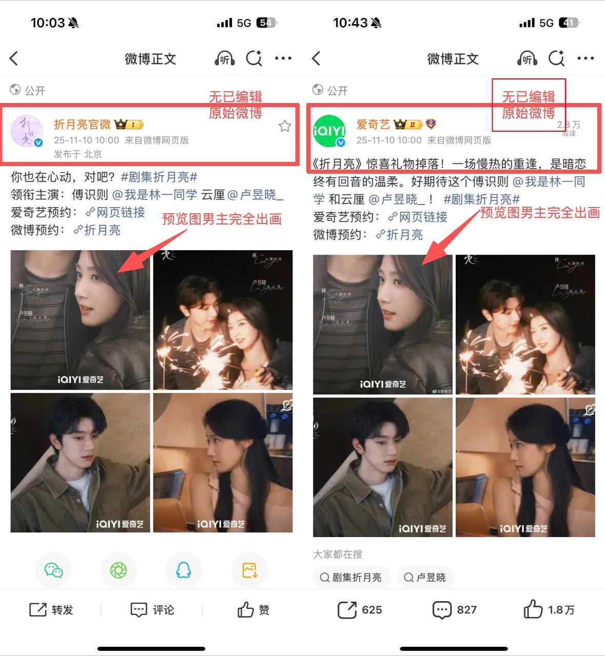 维权微博发出后不久折月亮官博开始编辑博文 以至于编辑记录前后出现不同差异