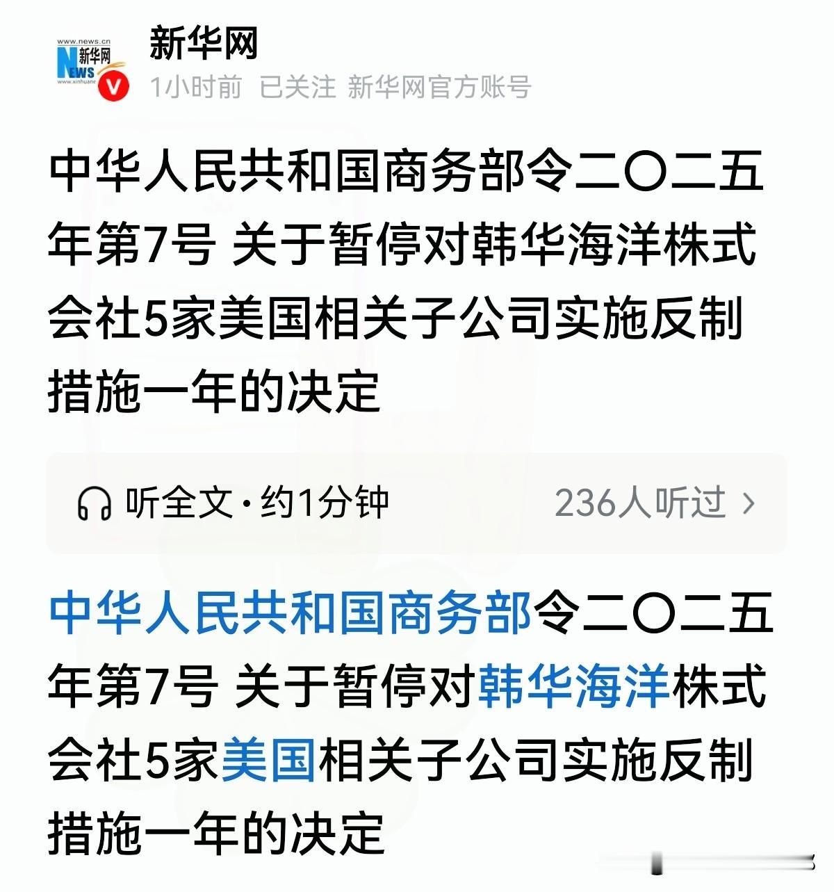 中方突然暂停 对韩华海洋反制? 这波操作不是让步,是精准拿捏的经贸博弈! 刚实施一个月的反制突然按下暂停键,很多人看不懂:韩华海洋的美国子公司之前可是帮美国递刀子,主动支持对华301调查,还掏50亿美元帮美国重建造船厂,摆明了要跟美国绑一起打压中国造船业。 但看懂背后的逻辑就知道,这绝非手软。之前中方反制精准戳中要害——韩华高度依赖中国船用钢材、稀土,反制让它建造成本暴涨10%。现在之所以暂停,是因为美方先退了一步,宣布暂停对华海事、物流和造船业的301调查措施一年。 这是典型的“你退我退,对等回应”,不是无底线妥协。暂停期只有一年,完全跟着美方的节奏走,主动权始终在我们手里。既给了中美经贸磋商留足空间,也给韩国企业递了个信号:别跟着美国一条道走到黑,绑死在别人的战车上没好果子吃,保持中立才能两边受益。 更关键的是,这招既体现了经贸博弈的灵活性,又守住了红线。反制是手段不是目的,通过“条件式缓和”,既避免供应链过度动荡,又警告了那些想趁机钻空子的企业——支持美国打压中国,就会被反制;美方收手,中方也能适时松劲。 你觉得这波“暂停反制”是高明的博弈智慧,还是给韩华留了太多余地?如果美方后续反悔,你觉得中方该立刻恢复反制吗?