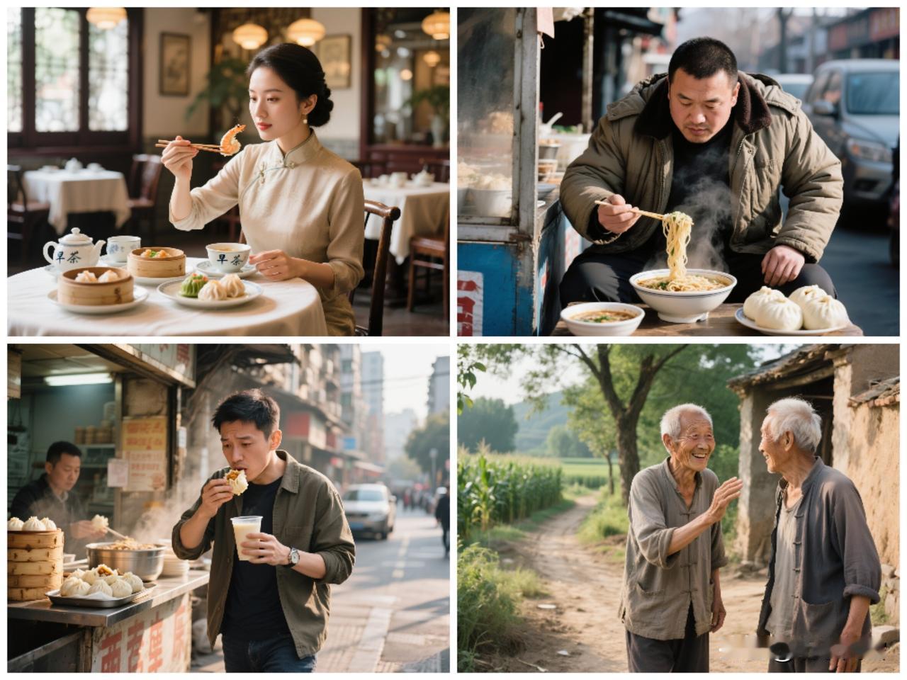 一说吃“早点”,南方人不明就里。 一听吃“早茶”,北方人浑身都起鸡皮疙瘩。 南方人说:你那是填肚子,我们是喝早茶!一盅两件,虾饺烧卖,慢火煨的是茶,更是人情! 南方人吃“早茶”优雅,不只是吃的事,细嚼慢咽,更注重悠闲。吃早茶是他们的社交文化。 北方人吃“早饭”豪横,没那么多讲究,主要是为填饱肚子。煎饼卷大葱,馒头萝卜干都是早饭。稀饭包子,三口两口下肚,扛活一上午。 城里人吃“早点”图快,豆浆面包、汉堡油条,中西合璧,选择多样,适应快节奏生活。 农村人见面问“吃过没?”,一碗玉米糊,半碟小咸菜,暖的是心。煮咸粥、拌面须、筒儿面,朴实直接,不求孬好,重在吃饱。 你以为这只是早餐? 不,这是刻在地域骨子里的生活: 南方重“品”,北方偏“吃”, 城市在“赶”,农村只“过”。 一餐饭,照见全国! 南北的饮食习惯不同, 爱“早茶”是一方民俗, 剋“早饭”是一种习惯, 吃“早点”突出生活本质, “吃过没?”包含乡情与问候。 从早茶、早点到早饭“过没?”这些不同的早餐方式,折射出全国各地不同的生活方式和地域文化。 说白了,粥粉面饭,暖胃家常。饺包茶饼,人间烟火,也抚凡人心。一顿早餐而已,分什么南北城乡。您说是不是? 万能生活指南记录真实生活 南方早茶 南北差异 早茶是种态度