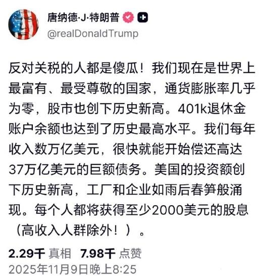 这波操作,总算是把“撒钱” 玩明白了:特朗普宣布说,美国收关税发财了,要给美国人发2000美元,还还清了37万亿美债! 粗略计算,按美国有3亿人算,就是6000亿美元现金? 这可吓得财长贝森特赶,他紧出来灭火说:“这2000美元,而是以红利和多种可能以形式出现!” 但是,普通的美国人就显得竟波澜不惊,有网友估计,特朗普可能因此,在中期选举招致惨败! 每个人都发,比都不发还可怕,一旦真发下来,物资统统涨价,以后的生活成本全都得涨! 至少有一半的美国人,也不会相信他这招,不过是骗你支持关税政策罢了。这是典型的“交易的艺术”的套路,先夸大筹码,收到效果后再收缩。 目前帖子已经不见了,应该是牛皮吹得太大了,他就删了。