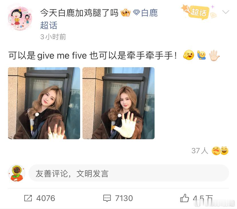 白鹿可以是givemefive《奔跑吧》新疆今天开跑啦,腿妈发来了新鲜的鹿🦌还整上活了[yeah]白鹿可以是give me five ,白鹿也可以和我牵手手[期待] 新疆录制顺利,玩得开心[送花花]奔跑吧