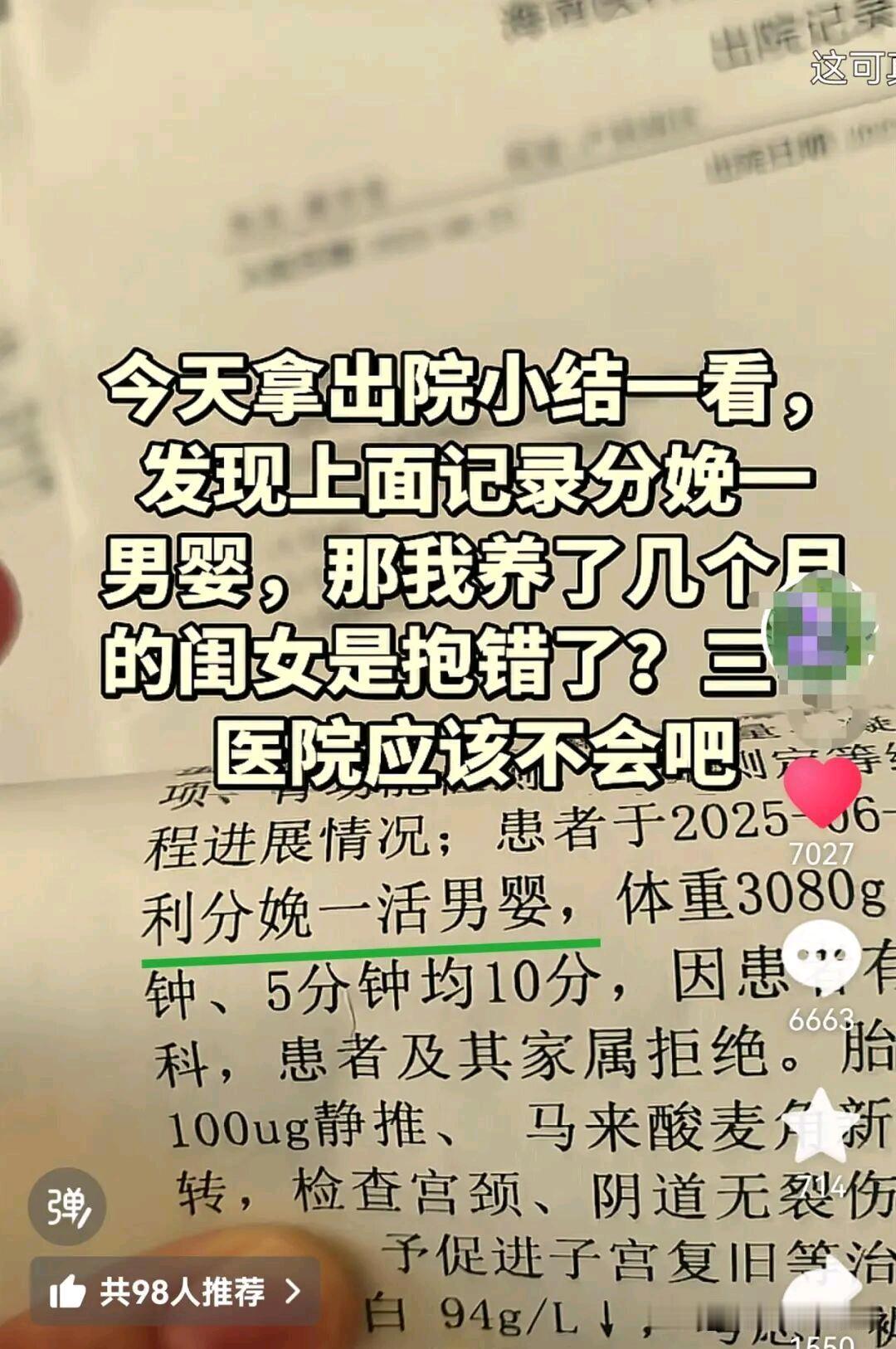 什么?我养了三个月的女宝宝?出院小结今天一看上面写我生的是男孩? 一位来自海南的新手宝妈在社交平台分享自己的困难。 本来去三甲医院生了一个宝宝很开心,又是一个小闺女,很可爱。 但是三个月以后,她出院小结一看上面写的是生了个男娃,那自己怀里的宝宝是谁的?同时在评论区后面她补充说当天确实还有一个人跟她一起生宝宝的,而且听对方回来之后,确实说对方自己生了个男宝宝。 这下心里慌了,赶紧去医院询问,医生说我们这边都有记录的,不会出问题的,不存在抱错的问题。 如果你认为报错了,认为有问题你可以去做亲子鉴定,如果一旦鉴定出来,确实是错了,所有的费用我们医院报销。