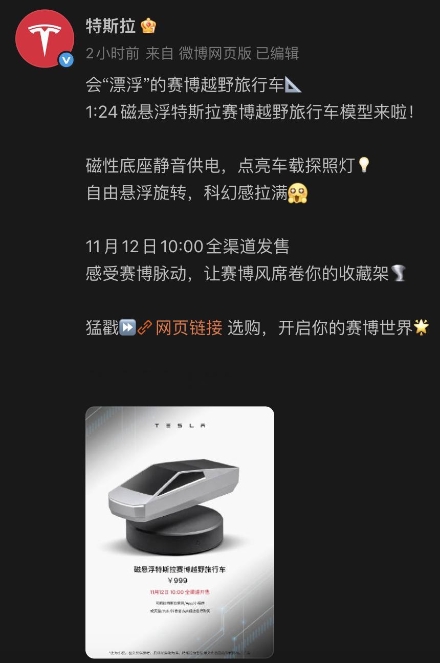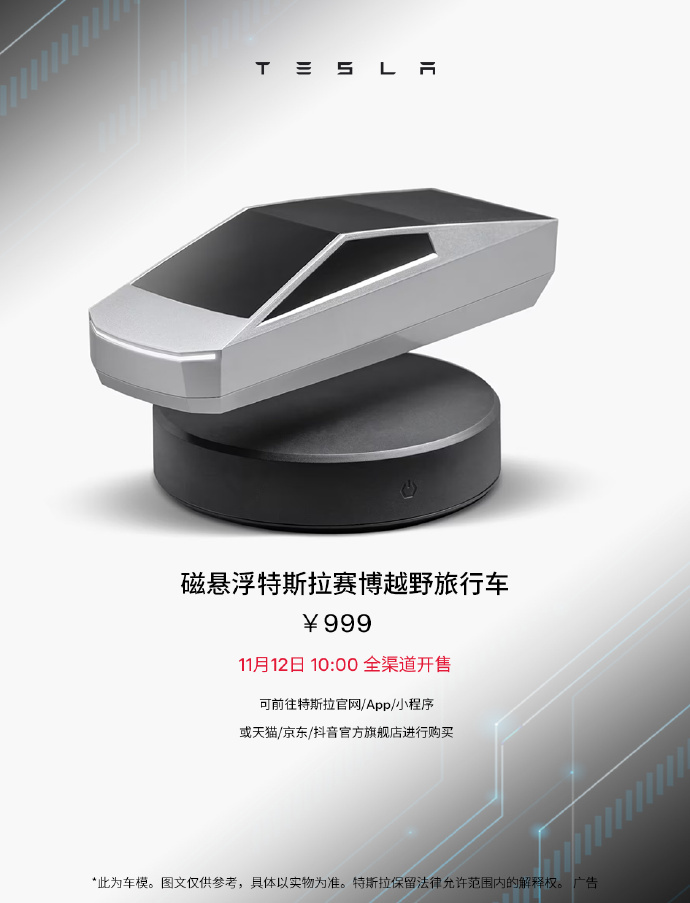 呃……标题党一下[坏笑] 官方推出了1:24磁悬浮特斯拉赛博越野旅行车模型,磁性底座静音供电,点亮车载探照灯,自由悬浮旋转,售价999元。