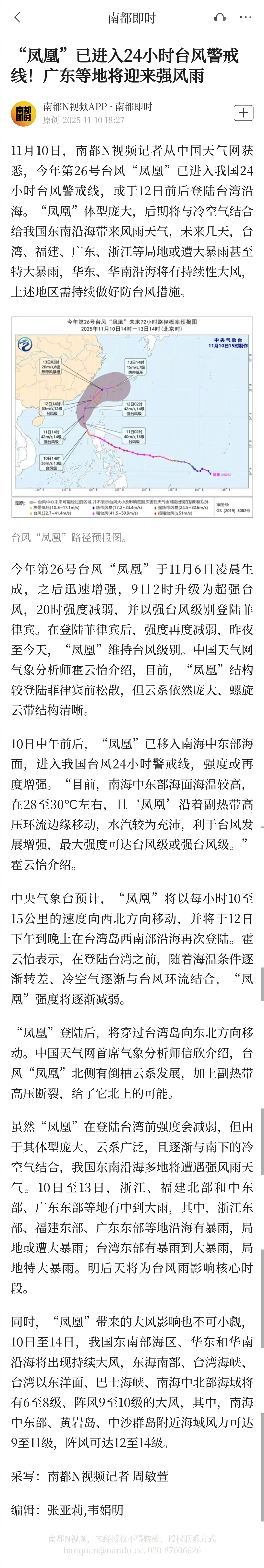 #凤凰将给广东带来强风雨#【“凤凰”已进入24小时台风警戒线!广东等地将迎来强风雨】#凤凰进入24小时台风警戒线#11月10日,南都N视频记者从中国天气网获悉,今年第26号台风“凤凰”已进入我国24小时台风警戒线,或于12日前后登陆台湾沿海。“凤凰”体型庞大,后期将与冷空气结合给我国东南沿海带来风雨天气,未来几天,台湾、福建、广东、浙江等局地或遭大暴雨甚至特大暴雨,华东、华南沿海将有持续性大风,上述地区需持续做好防台风措施。