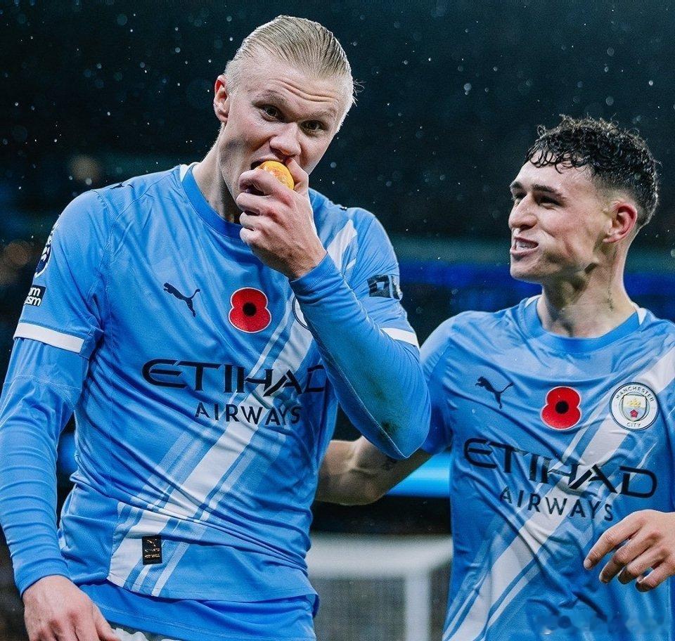 英超联赛第11轮,曼城在主场以3-0完胜利物浦。在比赛第63分钟多库取得进球后,在场边一同庆祝的哈兰德和福登直接啃起了苹果。