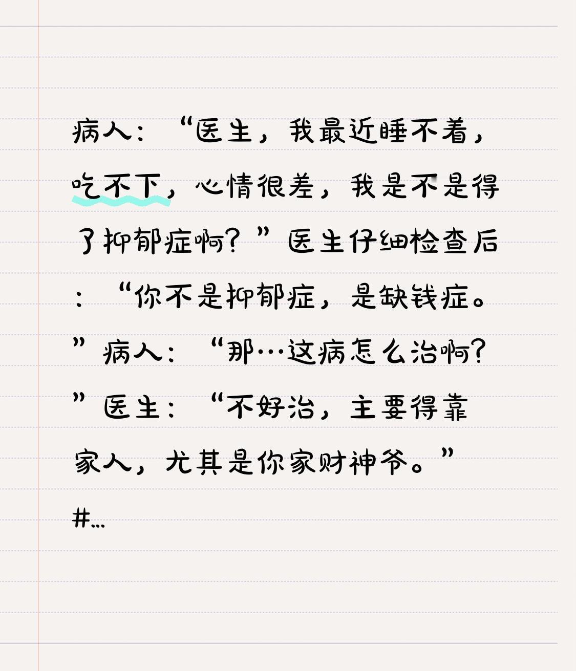 病人:“医生,我最近睡不着,吃不下,心情很差,我是不是得了抑郁症啊?” 医生仔细检查后:“你不是抑郁症,是缺钱症。” 病人:“那…这病怎么治啊?” 医生:“不好治,主要得靠家人,尤其是你家财神爷。”心理病了