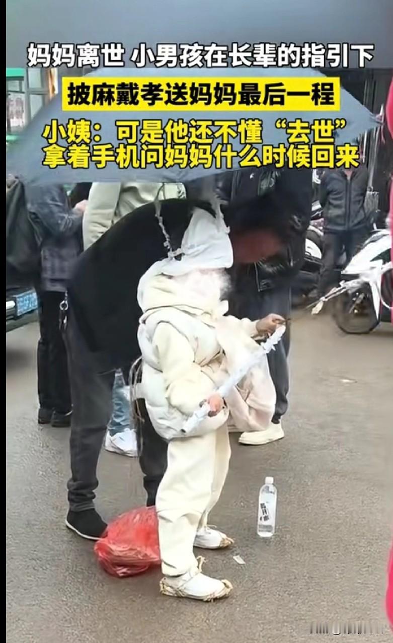 看这视频直接绷不住了——妈妈走了,小男孩被长辈领着披麻戴孝送最后一程,可他根本不懂“去世”是什么意思,攥着手机一个劲问:“妈妈什么时候回来?” 小小的身子裹在孝服里,跟着大人下跪、烧纸,动作懵懵懂懂的,可那句“妈妈什么时候回来”像针一样扎心——他还没明白,这一次分开,是再也等不到回应了。 小孩子的世界里没有“永远离开”,只觉得妈妈是出了趟远门,手机还能打通,还能等到那句“妈妈马上回家”。可大人们都知道,这把伞遮得住雨,遮不住他往后没有妈妈的人生。 这世上最疼的事,大概就是孩子还在等妈妈,妈妈却再也回不来了。你们有没有过那种“当时不懂,后来疼到喘不过气”的瞬间?
