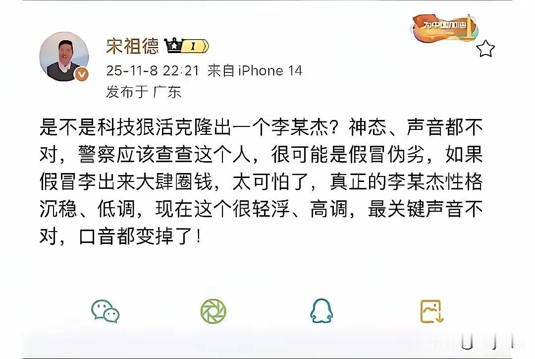 宋祖德老师说出了我们想说的话! 作为一个中国人,不应该质疑公众人物的真实性吗? 公众人物影响有多广泛多深远!尤其是一代影星李连杰,影响力涵盖了几代人:60后、70后、80后、90后,无人不知! 当年的武术冠军,老变少后更擅长跳舞! 当年的正气浩然,老变少后却轻浮跳脱! 当年的沉稳严肃,老变少后却嘟嘴卖萌! 这是李连杰吗?利智哪去了?他的女儿们呢?他不是最在意利智的吗?为什么从来不带她一起?