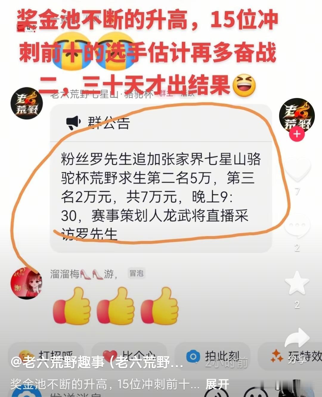 粉丝自掏腰包给第2名、第3名加设奖金。 罗先生觉得张家界荒野求生,努力闯进了前三名的应该都要有奖励,这比赛不是靠运气,能进前三意味着有一定的生存技能、耐力、心态,他们的精神也要得到尊重,也是对他们实力的认可,第2名5万,第3名2万。 选手们听到这个消息,会跟打了鸡血一样,把自己的看家本领都拿出来,比赛时间又得延长,进了前10保底就有2万,决赛就算没有拿到冠军,好歹前三名也有奖励,也没有辜负自己在这里吃不饱又穿不暖的生活,就怕他们会为了钱硬扛身体极限。 这个挑战赛特别的火爆,第3季报名的人已经破万了,完善前三名的奖励,既能让奖励更公平,也能吸引更多高手参赛,让比赛更有看点,还可以带动景区的旅游。