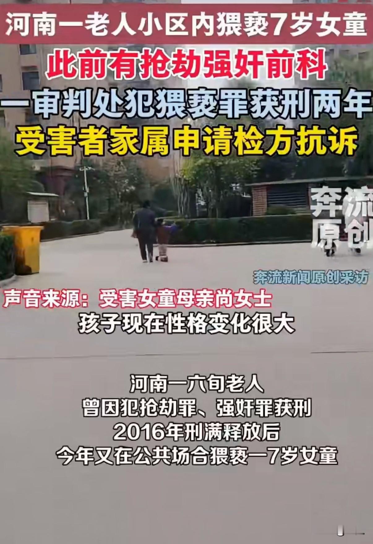 六十岁老人猥亵七岁女童,竟只判两年?孩子妈妈的一句话让人心疼:“我们没谅解,法院也认定了从重情节,可结果还是太轻。” 这事发生在河南郑州。殷某曾因抢劫、强奸坐牢,刑满释放后竟在小区花园对邻居家7岁女孩下手。孩子反抗逃走后,家人立刻报警。 法院认定他在公共场所猥亵儿童,且有前科,却只判了两年。民事赔偿也因“证据不足”被驳回。 更让人心寒的是,被告家属还在小区里挑衅受害人家属。目前孩子家属已向检察院申请抗诉。 屡教不改的罪犯,该如何保护我们的孩子?这值得全社会深思。