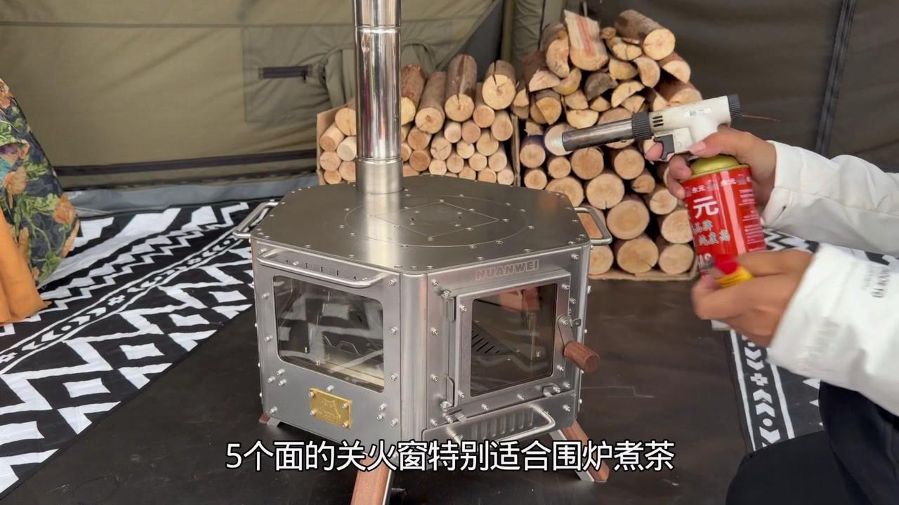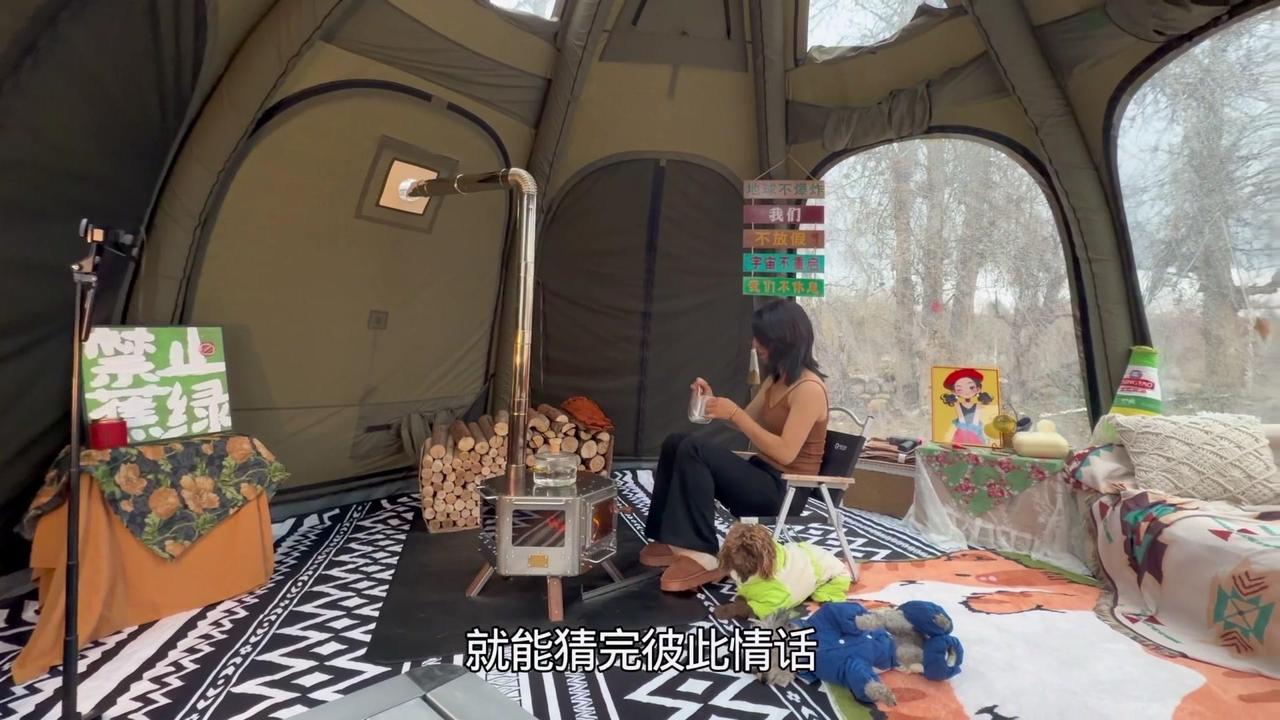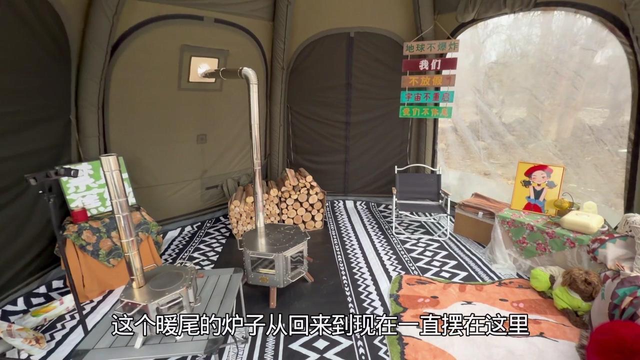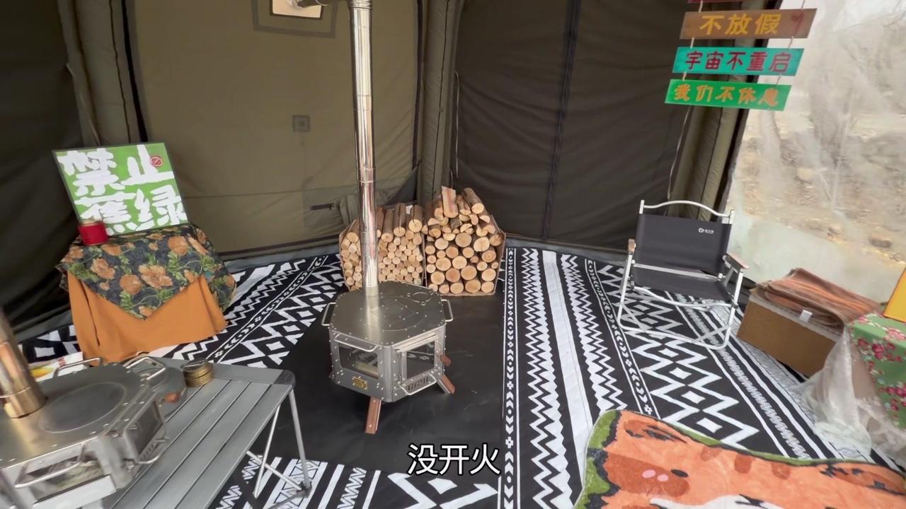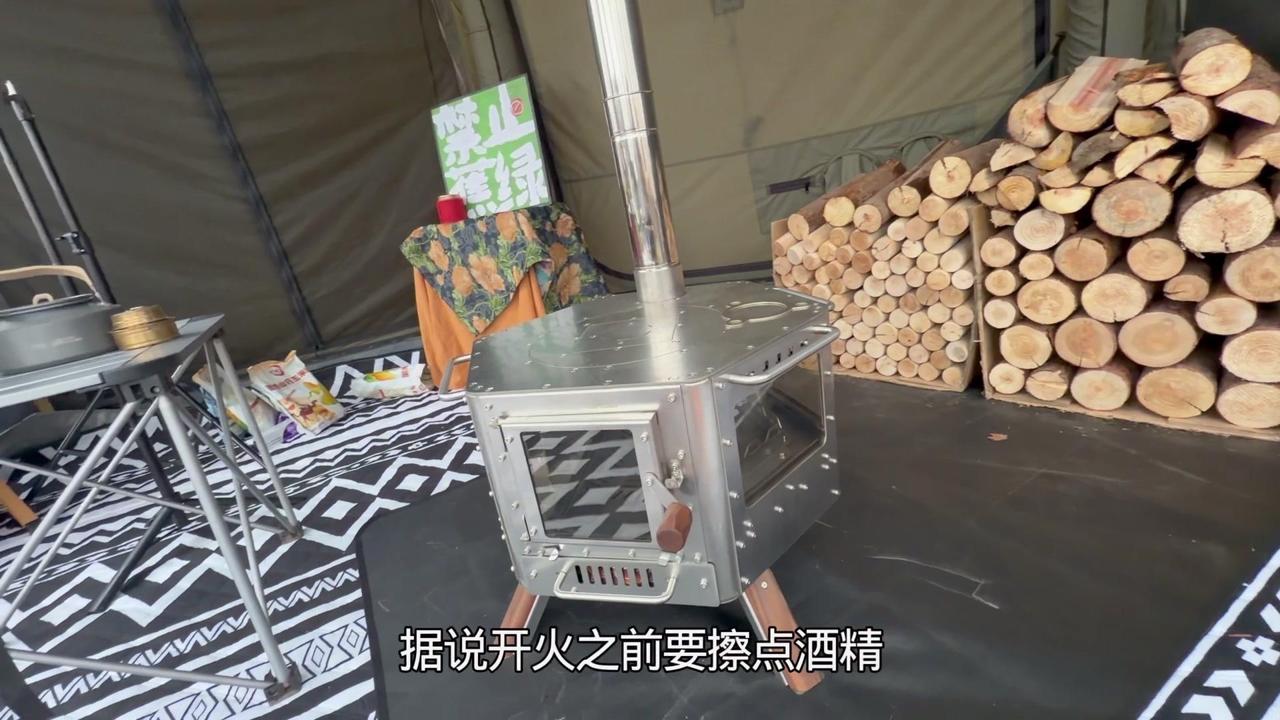 新疆阿勒泰的天气真的让人捉摸不透,说好的两米厚大雪和零下五十度,结果最近一直阴天,房车里面的电都快耗尽了。昨天晚上用小车给房车充电,半夜竟然下雨了,还好有车友贴心地拿盆子把充电插头扣上,现在电已经充满了。 今天下午要做一件大事——开柴火炉!这个从买回来就一直没开火的六边形暖尾炉,五个面的关火窗特别适合围炉煮茶。我准备了些柴火,先用酒精擦了擦炉口,据说这样开火更顺利。炉子有20公斤重,外面是304不锈钢材质,接灰网还特意设计成凸起来的,能避免木材贴到玻璃上熏黑。 劈好柴后,我赶紧把炉子点上。才烧了一会儿,帐篷里的温度就已经升到30度了,17.6个平方的空间里,这个20公斤的大家伙完全够用。透过玻璃窗看着跳动的火焰,所有烦恼好像都被治愈了,现在穿着吊带在里面,等晚上就能看雪景了,想想都觉得美好。
