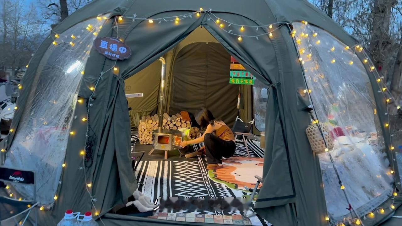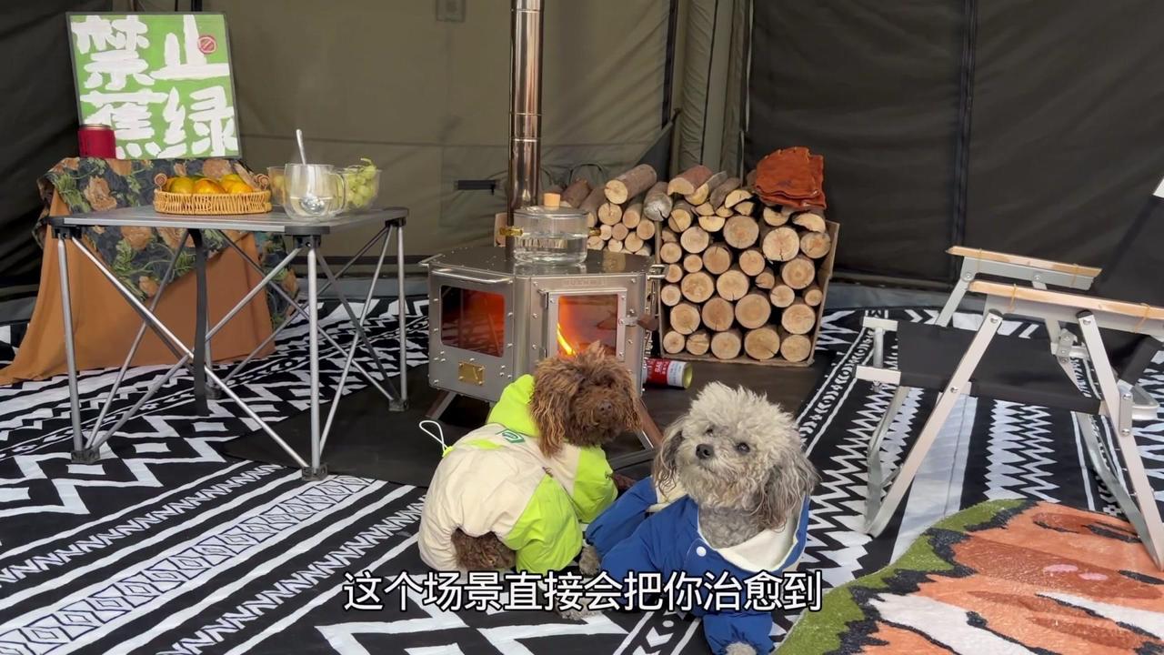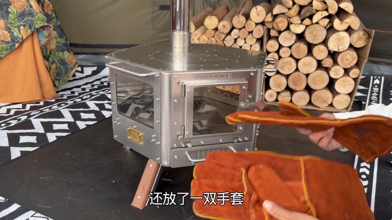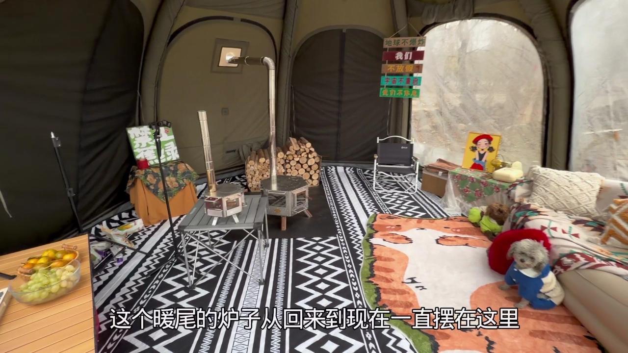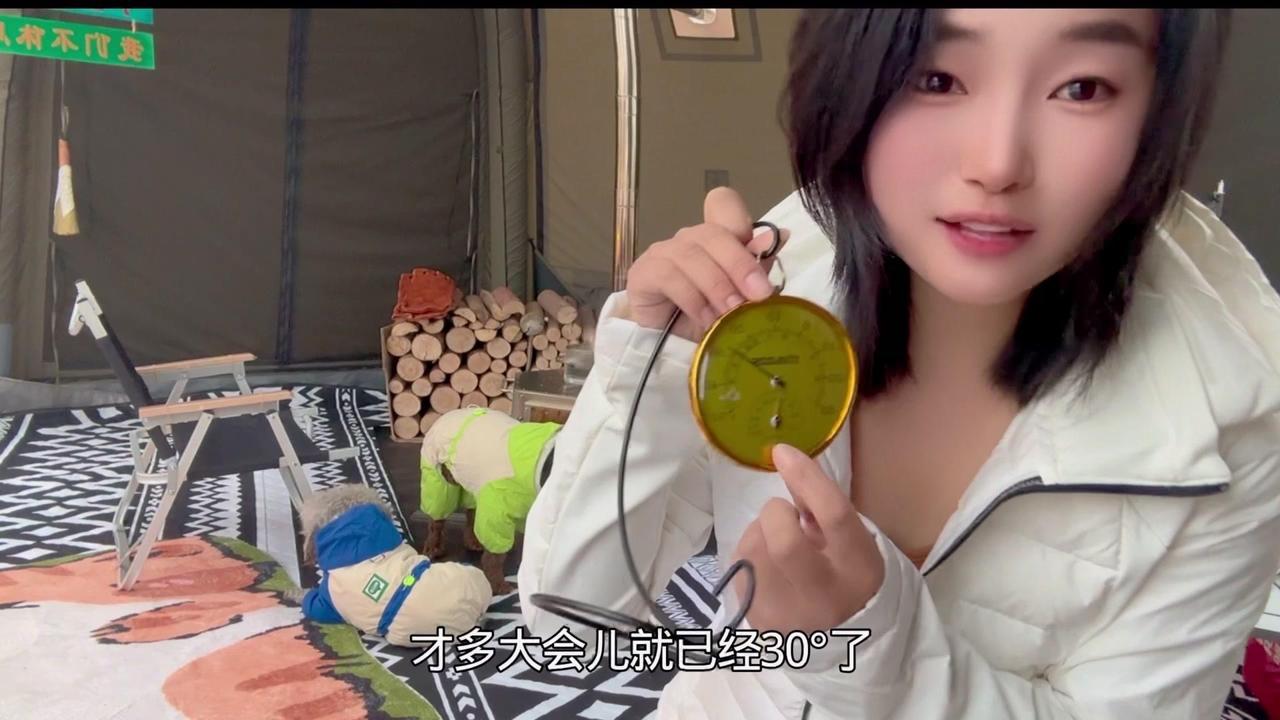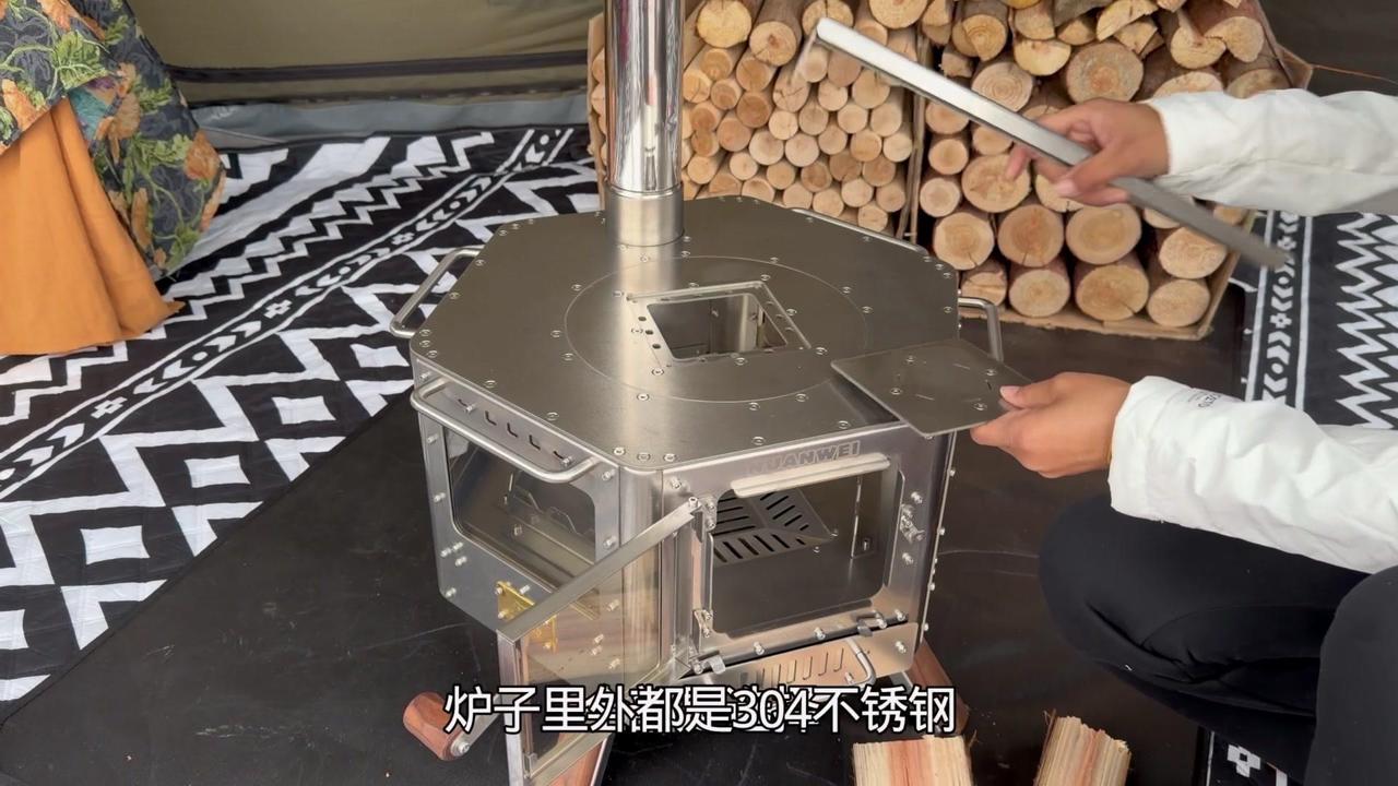 新疆阿勒泰的天气真的让人捉摸不透,说好的两米厚大雪和零下五十度,结果最近一直阴天,房车里面的电都快耗尽了。昨天晚上用小车给房车充电,半夜竟然下雨了,还好有车友贴心地拿盆子把充电插头扣上,现在电已经充满了。 今天下午要做一件大事——开柴火炉!这个从买回来就一直没开火的六边形暖尾炉,五个面的关火窗特别适合围炉煮茶。我准备了些柴火,先用酒精擦了擦炉口,据说这样开火更顺利。炉子有20公斤重,外面是304不锈钢材质,接灰网还特意设计成凸起来的,能避免木材贴到玻璃上熏黑。 劈好柴后,我赶紧把炉子点上。才烧了一会儿,帐篷里的温度就已经升到30度了,17.6个平方的空间里,这个20公斤的大家伙完全够用。透过玻璃窗看着跳动的火焰,所有烦恼好像都被治愈了,现在穿着吊带在里面,等晚上就能看雪景了,想想都觉得美好。