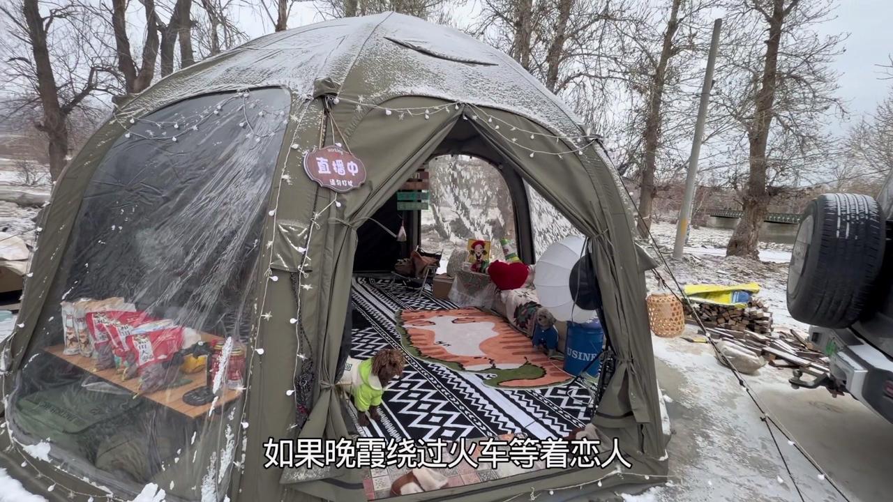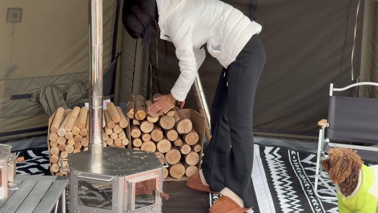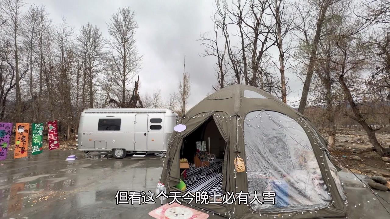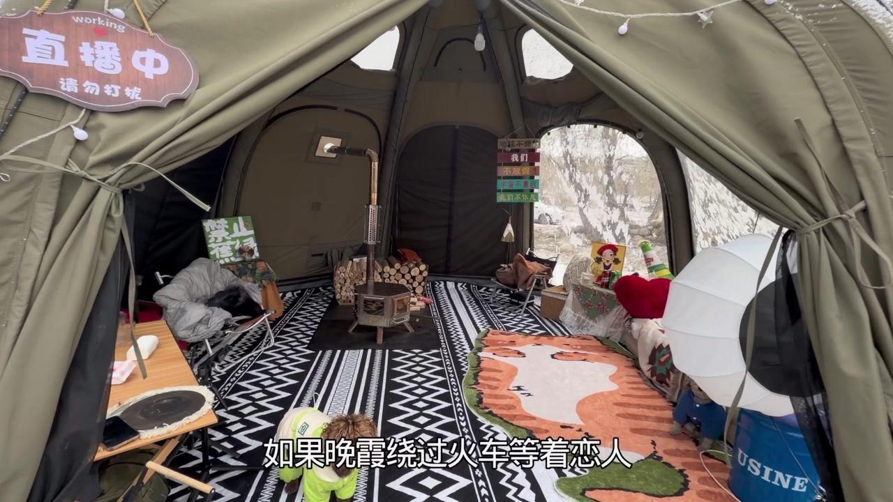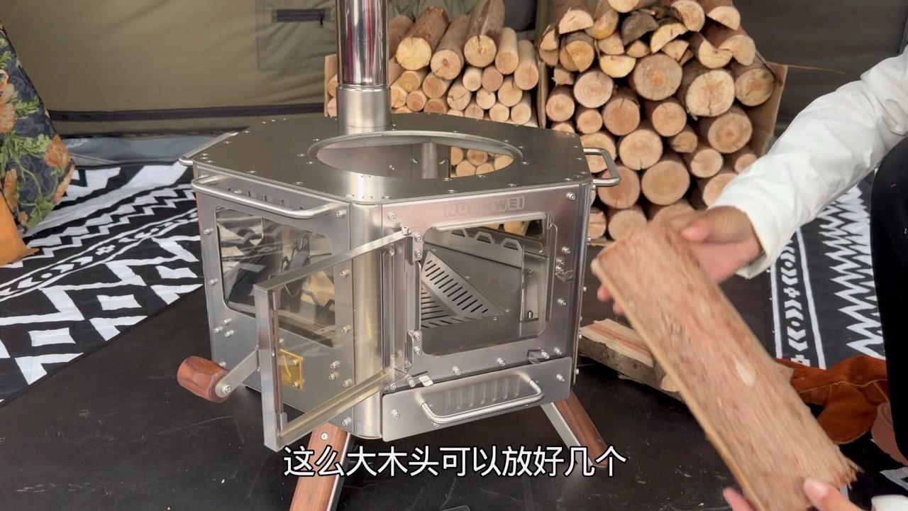 新疆阿勒泰的天气真的让人捉摸不透,说好的两米厚大雪和零下五十度,结果最近一直阴天,房车里面的电都快耗尽了。昨天晚上用小车给房车充电,半夜竟然下雨了,还好有车友贴心地拿盆子把充电插头扣上,现在电已经充满了。 今天下午要做一件大事——开柴火炉!这个从买回来就一直没开火的六边形暖尾炉,五个面的关火窗特别适合围炉煮茶。我准备了些柴火,先用酒精擦了擦炉口,据说这样开火更顺利。炉子有20公斤重,外面是304不锈钢材质,接灰网还特意设计成凸起来的,能避免木材贴到玻璃上熏黑。 劈好柴后,我赶紧把炉子点上。才烧了一会儿,帐篷里的温度就已经升到30度了,17.6个平方的空间里,这个20公斤的大家伙完全够用。透过玻璃窗看着跳动的火焰,所有烦恼好像都被治愈了,现在穿着吊带在里面,等晚上就能看雪景了,想想都觉得美好。