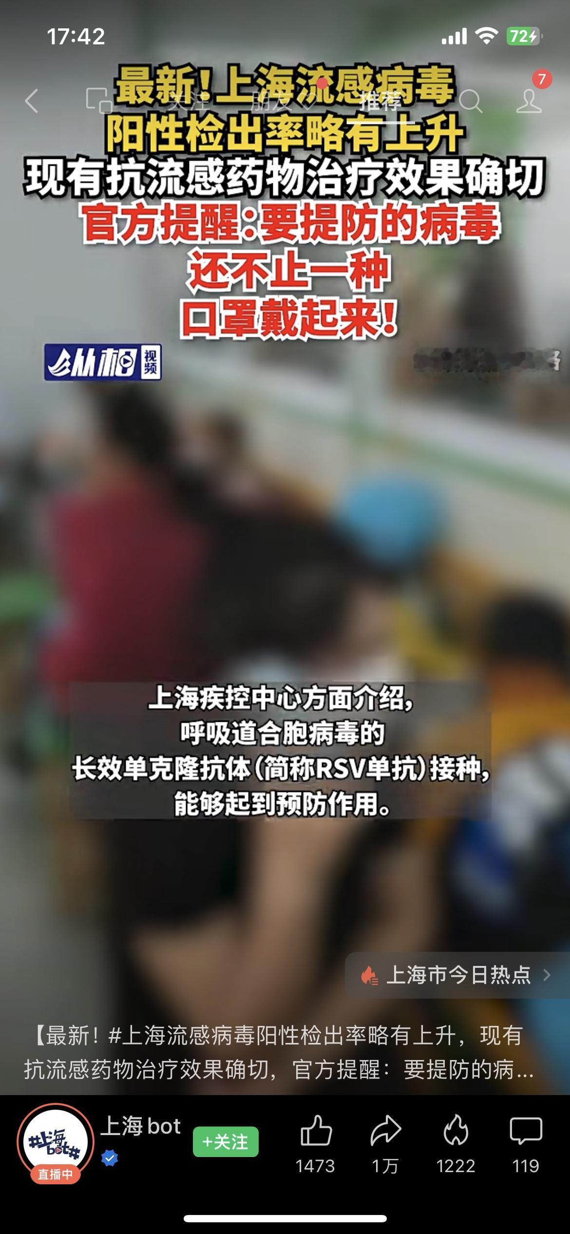 上海流感阳性率上升!除了流感,还要防这病毒… 上海的朋友紧急提醒!流感病毒阳性检出率开始涨了,官方说不光要防流感,其他呼吸道病毒也得盯紧——口罩赶紧戴回来! 另外上海疾控说RSV单抗能防呼吸道合胞病毒,家里有老人小孩的可以多留意~特殊时期,防护真不能松! 上海流感 秋冬呼吸道防护 疾控最新提醒病毒流感 秋冬流感