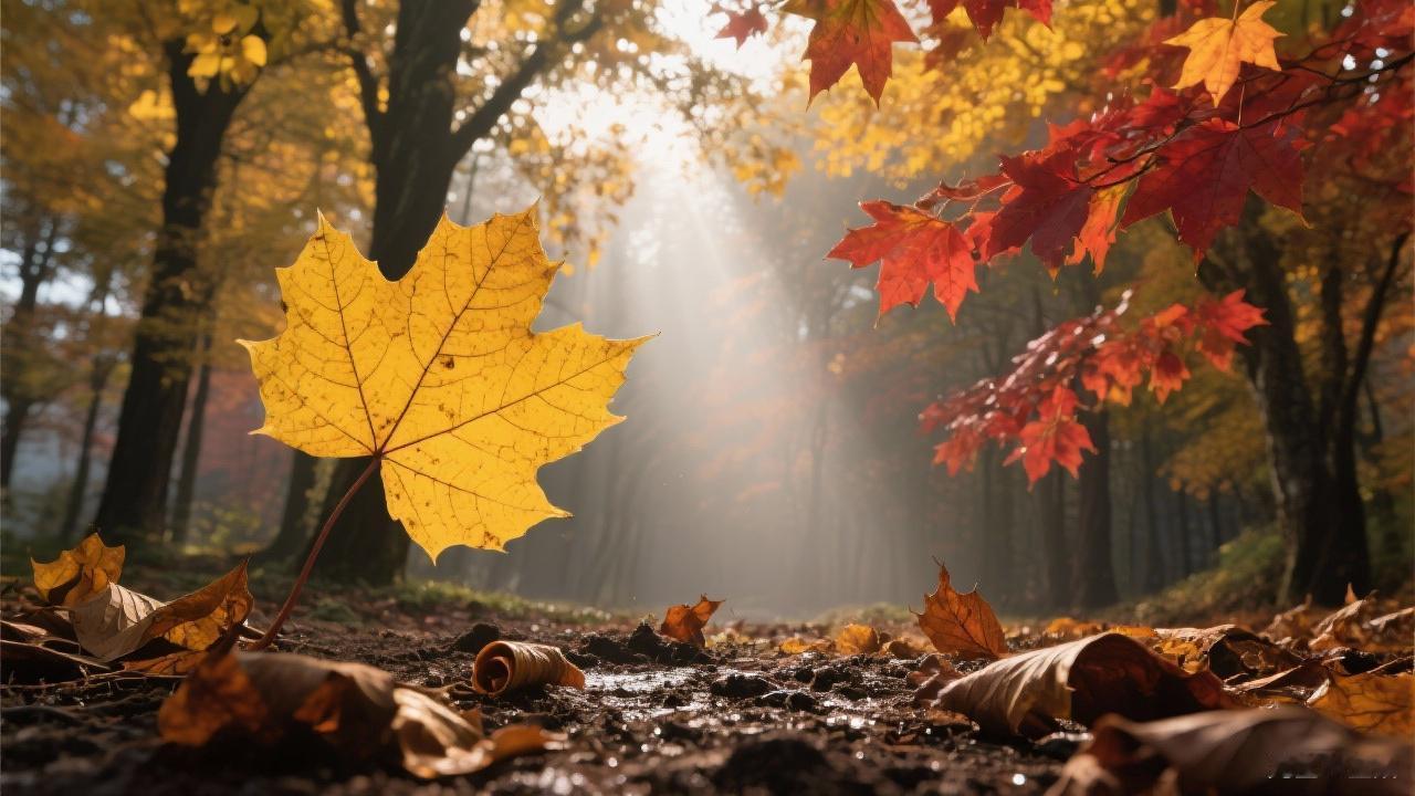 秋日暖阳下,红叶与黄叶交织,少女轻倚树旁,微笑如花。