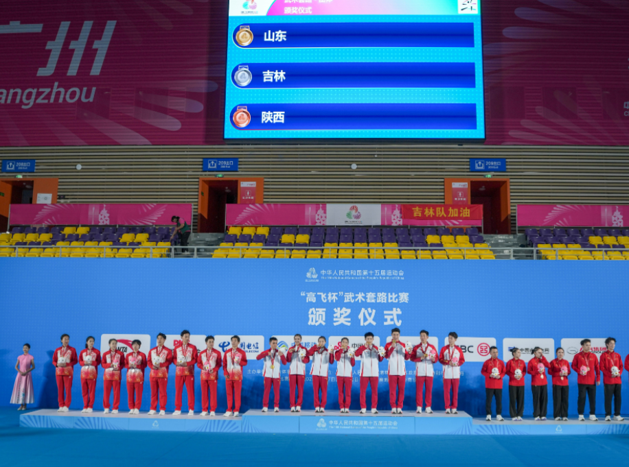 第十五届全国运动会武术套路团体比赛在广州举行。山东队夺得金牌,吉林队、陕西队分获银牌、铜牌。