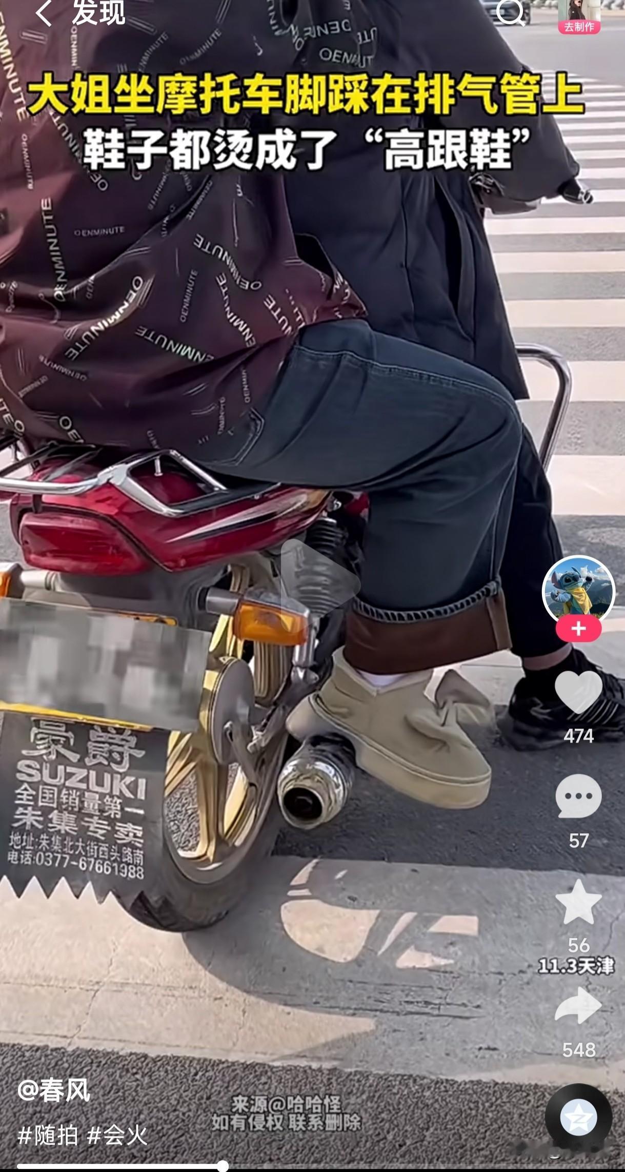 脚踩排气管平底鞋被烫成高跟鞋 这样的一幕是不是似曾相识 对于坐过摩托车的人来说 经历最多的就是烫坏鞋底 然而烫坏裤子的也不在少数 一切都是因为这种老款的脚没地方放 侧着坐在上面指定不安全 骑着坐在后面一只脚只能踩排气管 踩在排气管上面就是太废鞋了 这烫坏了还能穿吗