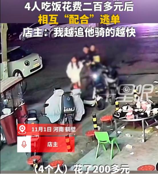 “必须严惩!”11月1日,河南鹤壁,两位小伙带着两个女孩来到一家餐馆吃饭,4个人一共消费了200多元,谁知最后要付款时,4个人却互相打掩护逃单!店主追出去100多米,没想到这4个人却骑得飞快逃走,网友:小小年纪就学会这些了? “你们饭还没付钱呢!”店主一边喊,一边追了出去,可那四个年轻人早已骑上电动车,呼地一下子冲进夜色里,连头都没回。 吃饭时,这伙人看起来没什么异常,边吃边聊,还不停拍照发动态。等饭吃得差不多时,一男一女率先起身,说要出去透透气。老板也没多想,毕竟吃饭的人中途出去透气的情况常有。 可没多久,剩下的男生也起身,说是“吃撑了有点想吐”,摇摇晃晃走到门口,扶着树做呕吐状。那名留在屋里的女生一边假装看手机,一边偷偷往门外张望。 就在这时,门口那名女生竟已经把电动车发动好,停在一辆轿车后面等候。等那名假装呕吐的男生一个转身,两人一起飞快上车骑走。屋里的女生见状,也不再掩饰,立刻冲出去跳上另一辆电动车。 老板这才反应过来不对劲,可四人骑得飞快,车轮溅起的灰尘几乎没给他留下一点机会。张老板追出一百多米,喊得嗓子都哑了,但那几辆车的尾灯早已消失在拐角。 当晚,他把监控视频发到了网上,希望这些人看到后能主动回来付款。视频一出,评论区炸开了锅。有网友骂道:“现在的年轻人怎么都不讲点良心?200块钱的账都要赖?”也有人讽刺地说:“这配合得比电视剧还默契,看来不是第一次干了。” 从视频看,那四人确实分工明确,行动迅速,简直像是提前排练过的。一个分散注意力,一个制造假象,另一个准备逃跑路线。短短几十秒的配合,竟让老板毫无防备。 但这并不是个“恶作剧”那么简单。餐馆逃单的金额虽不大,但如果是多人合谋、事先策划,就已经触及法律底线。换句话说,这种“玩心大”的小年轻,若真被抓到,恐怕得在拘留所里“反省”几天。 而更让人担心的,是这种行为背后的心态。如今一些年轻人,嘴上说着“压力大”“没钱花”,但却能一边吃喝玩乐、一边动歪脑筋。殊不知,一顿饭的钱不值什么,但被曝光的信用污点、被追责的后果,却足以让他们后悔多年。 希望这四个人看到网上的消息后,能主动补上那顿饭钱,也算给自己留一点体面。毕竟逃得了一时,逃不了一世,社会的容忍,不是纵容。诚信一旦丢了,未来走到哪儿都得摔跟头。 信息来源: 哈尔滨日报丨两男两女餐馆消费200元后打配合逃单 文丨小王 编辑丨史叔