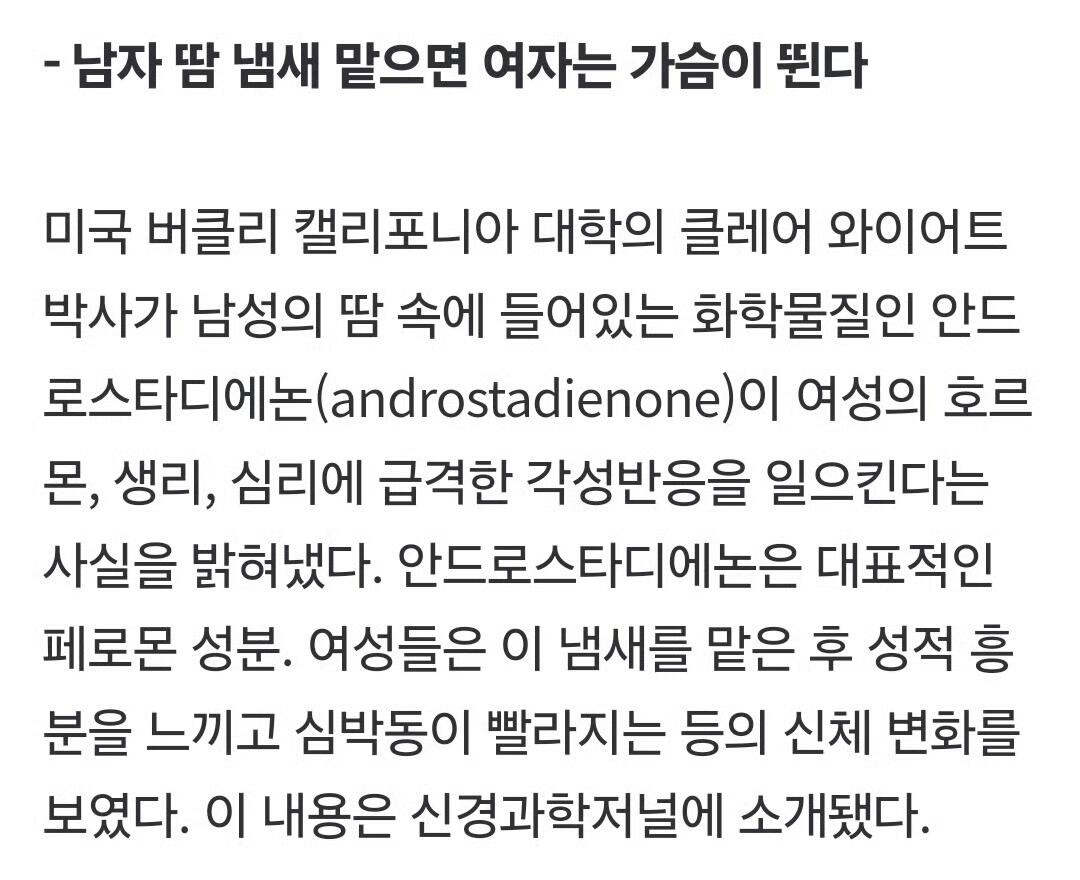 美国加州大学伯克利分校的克莱尔·怀亚特博士发现,男性汗液中含有一种名为雄烯二酮(androstadienone)的化学物质,它会引发女性在荷尔蒙、生理和心理方面的强烈唤醒反应。