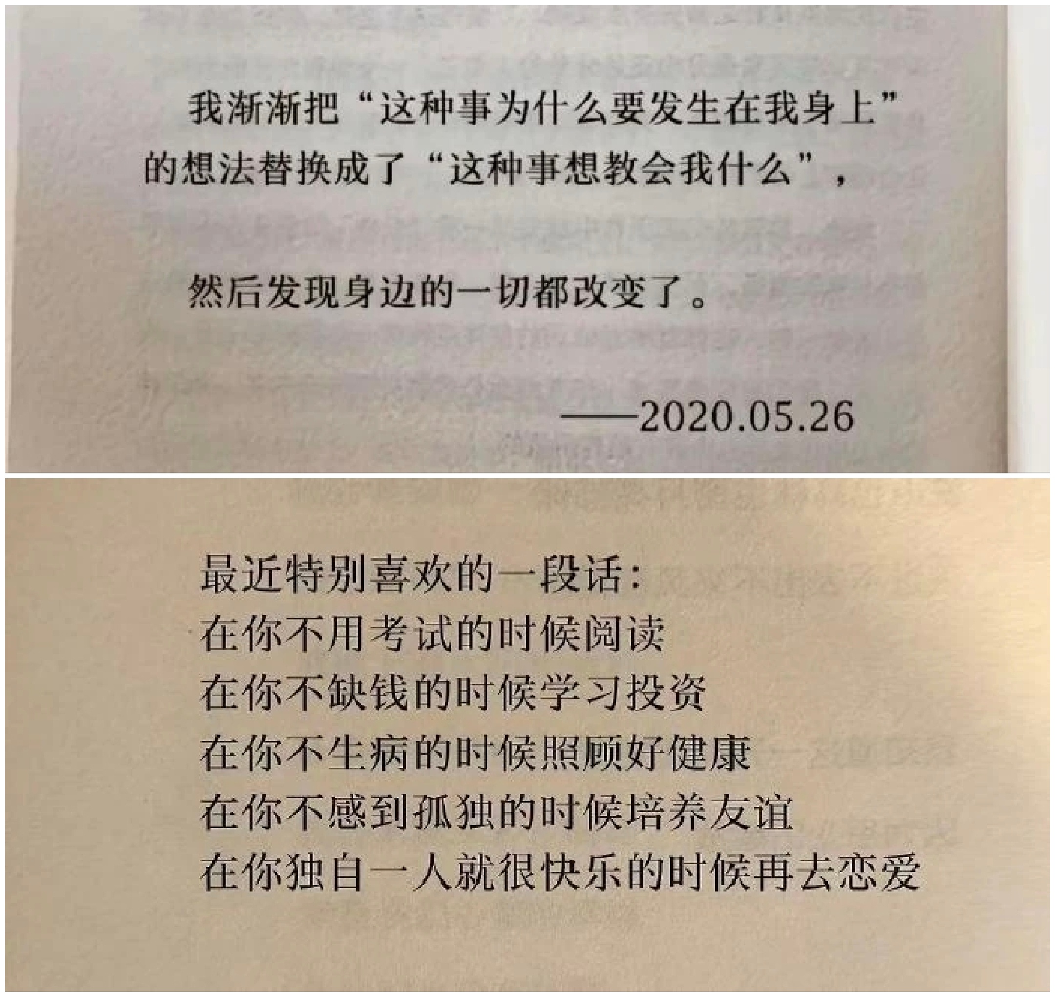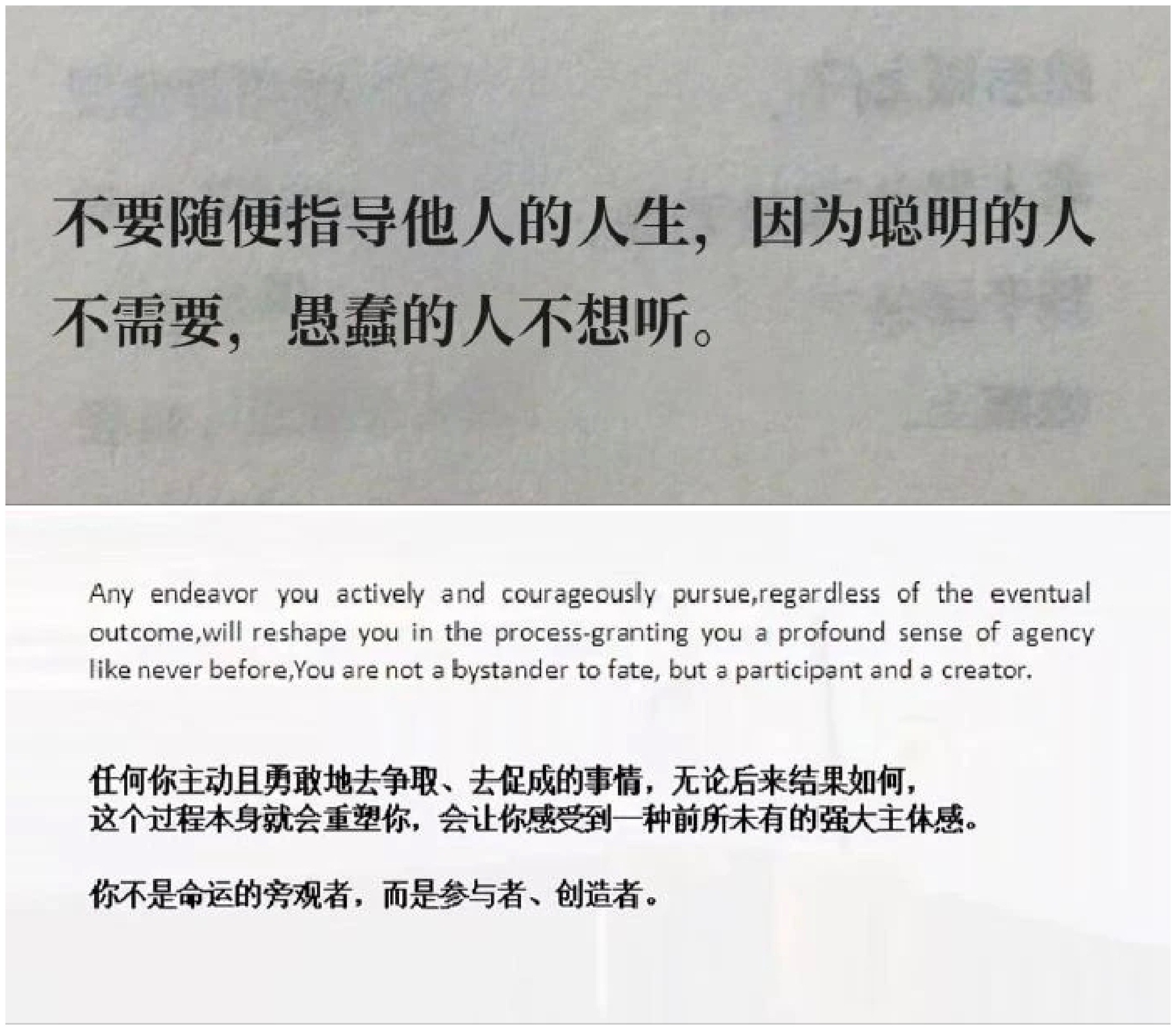 把“这种事为什么要发生在我身上”的想法,替换成了“这种事想教会我什么”,会发现身边的一切都改变了。不要随便指导他人的人生,因为聪明的人不需要,愚蠢的人不想听。